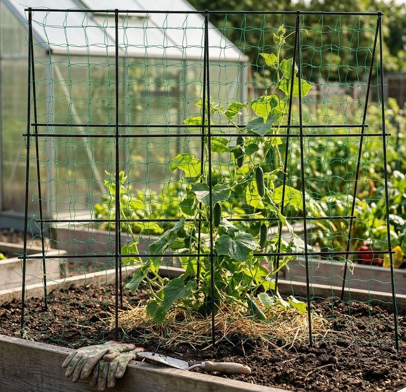 - Sustinere pentru plante cataratoare: Permite cresterea verticala a culturilor precum castravetii, fasolea sau mazarea