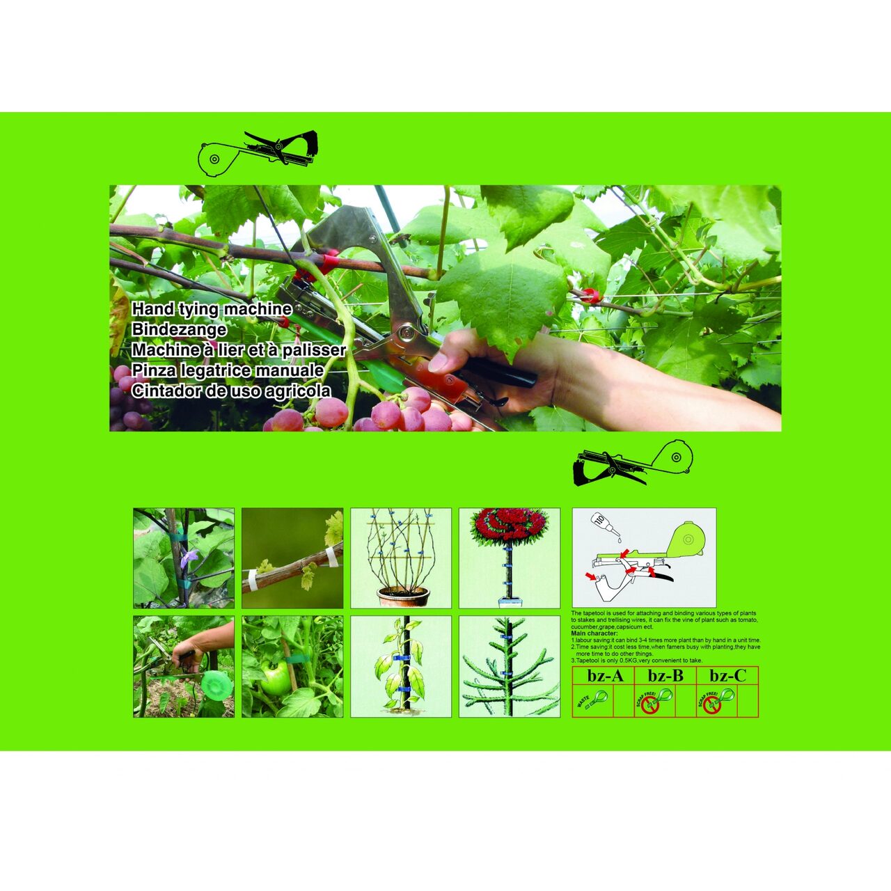 * Obtine o EFICIENTA de 4-5 ori mai mare in legatul de vita de vie, rosii, castraveti, ardei si a altor plante urcatoare fata de lucrul manual, folosind aparatul de legat cu banda 150x63mm.