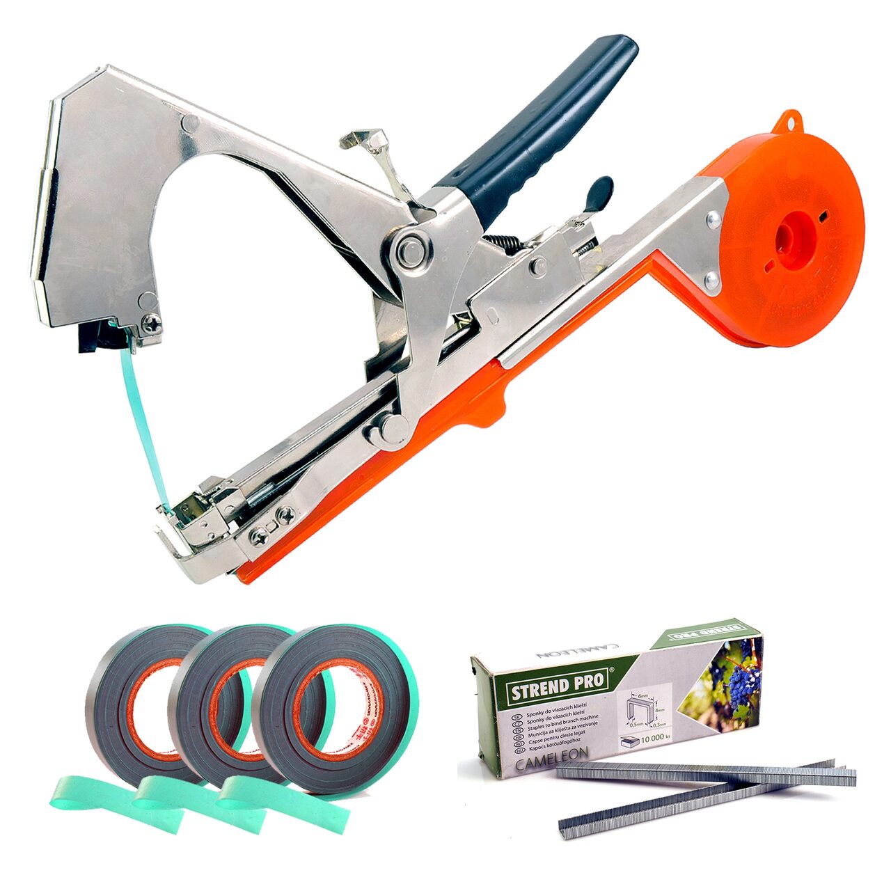 * Aparatul FIXEAZA plantele de parii de sutinere sau de sarme si se foloseste impreuna cu banda din polipropilena si capse care se pot achizitiona si separat. Banda cod 217893,Capse cod 2170325.