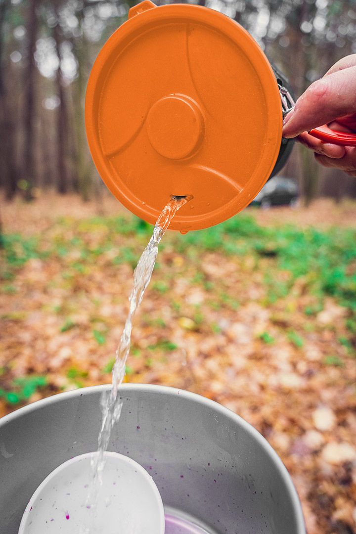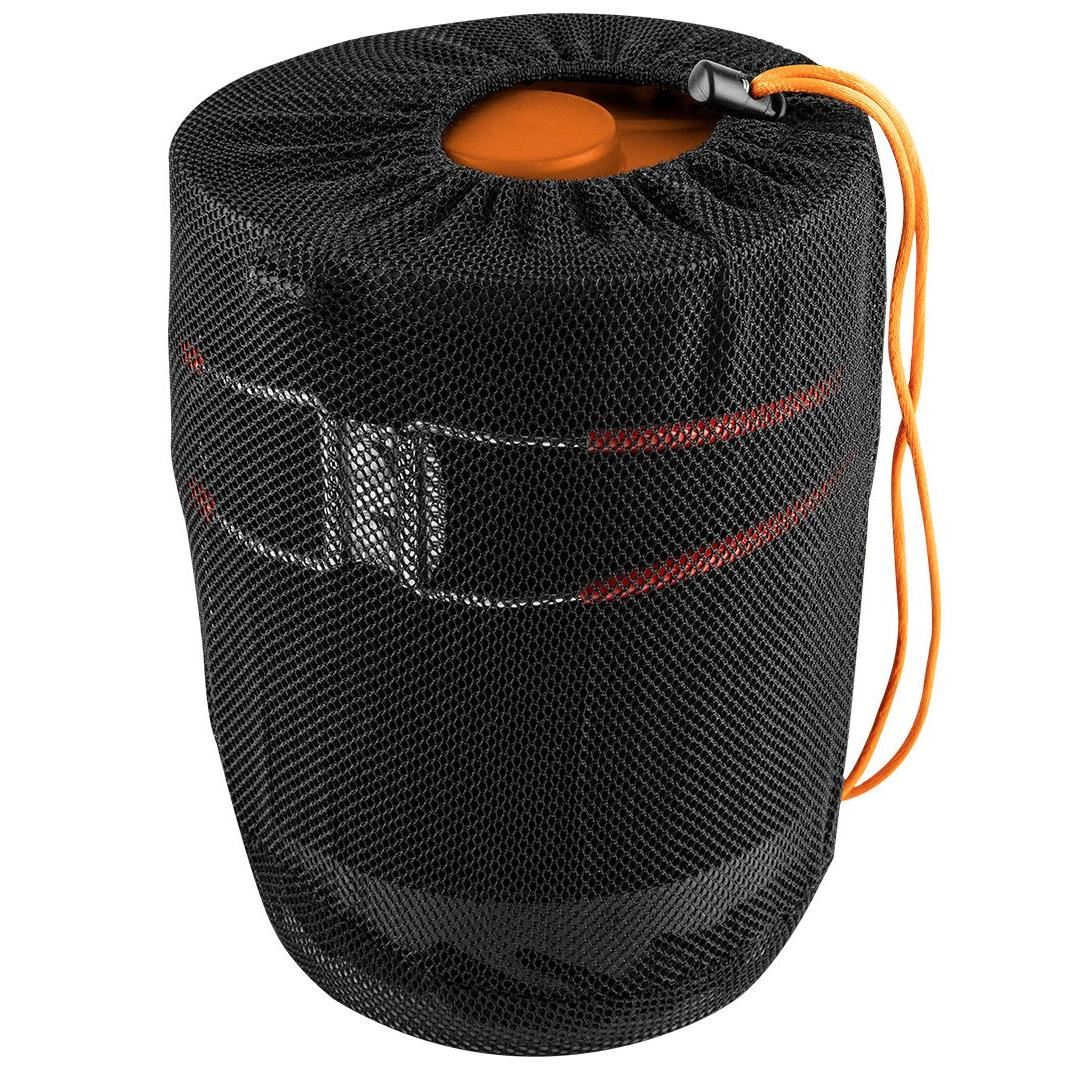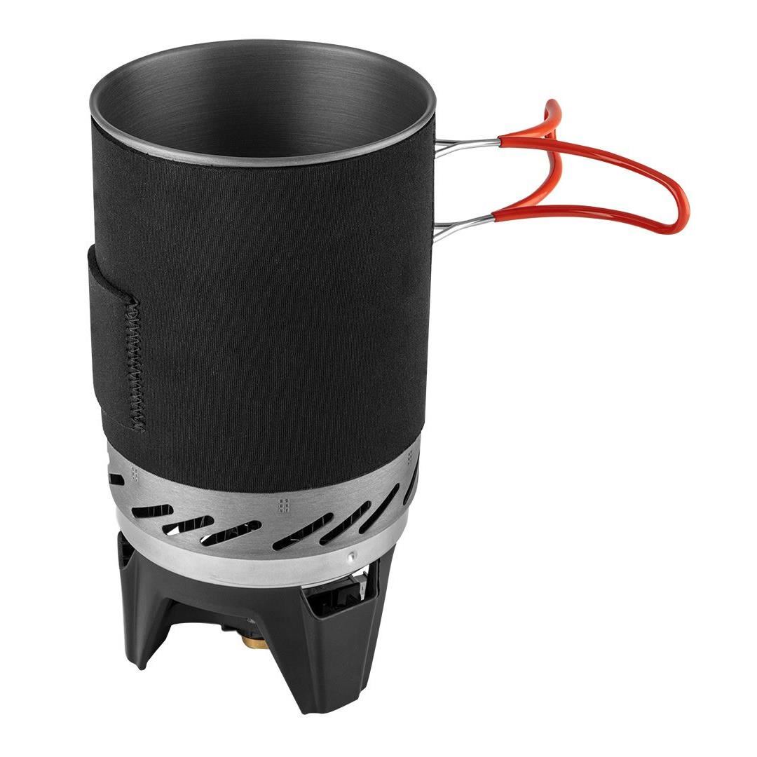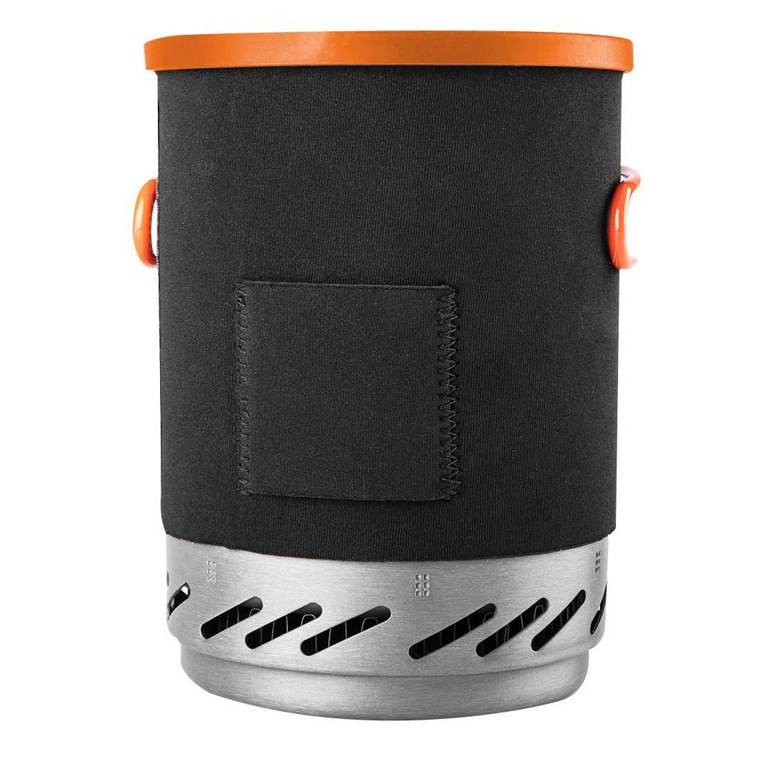 Vasul este realizat din aluminiu anodizat si acoperit suplimentar cu un capac din neopren. Manerele pliabile, izolate, nu se incalzesc si nu ocupa mult spatiu in timpul transportului. Datorita gratarului care protejeaza flacara de vant, aragazul este mai eficient cu pana la 30%.