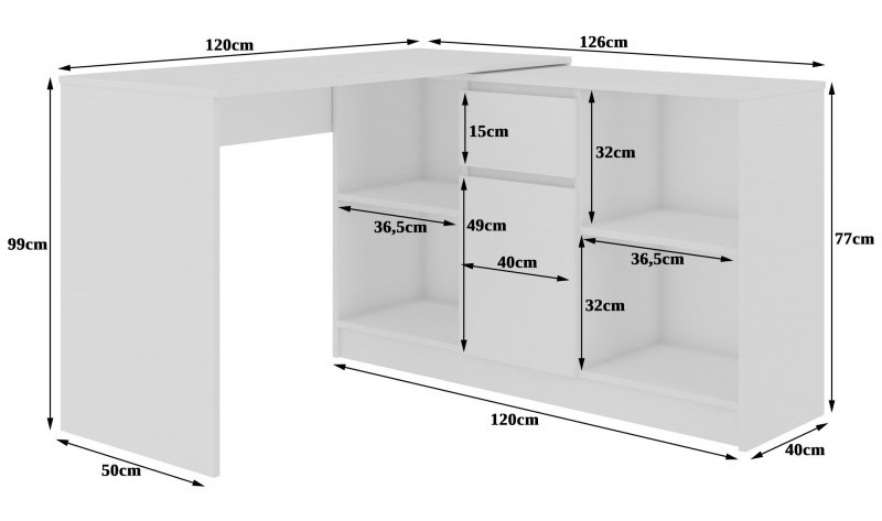 Birou calculator pe colt, placa laminata, 1 sertar, 6 rafturi, stejar si alb, 120x126x79/77 cm