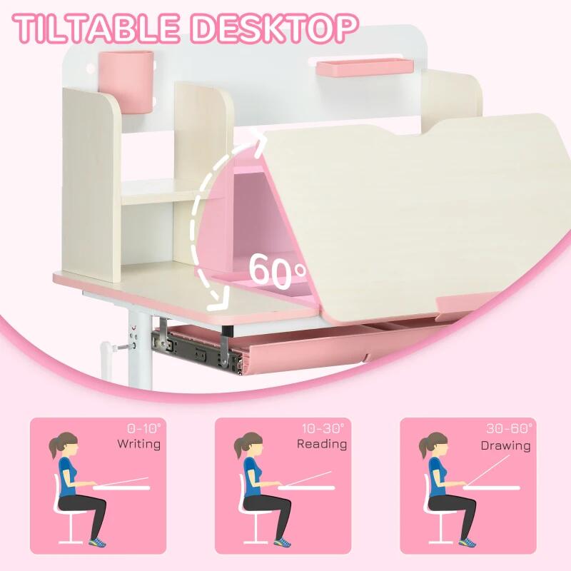 Birou cu scaun pentru copii 3-12 ani, inaltime reglabila, PP, MDF, otel, cu rafturi, roz