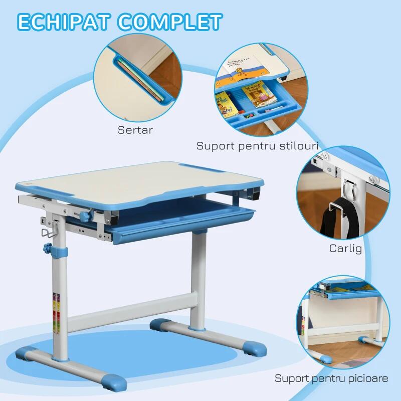 Birou cu scaun pentru copii 6-12 ani, banca scoala, inaltime reglabila, PP, MDF, otel, blat cu inclinare, albastru