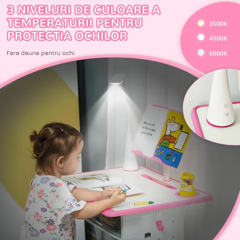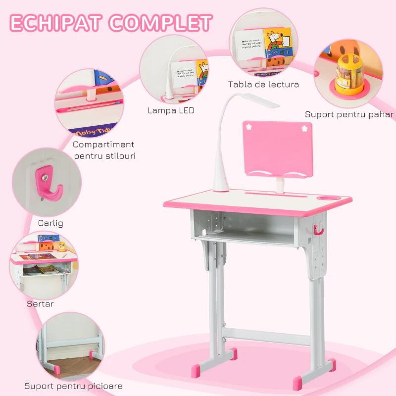 Birou cu scaun pentru copii 6-12 ani, inaltime reglabila, PP, MDF, otel, lampa USB, roz