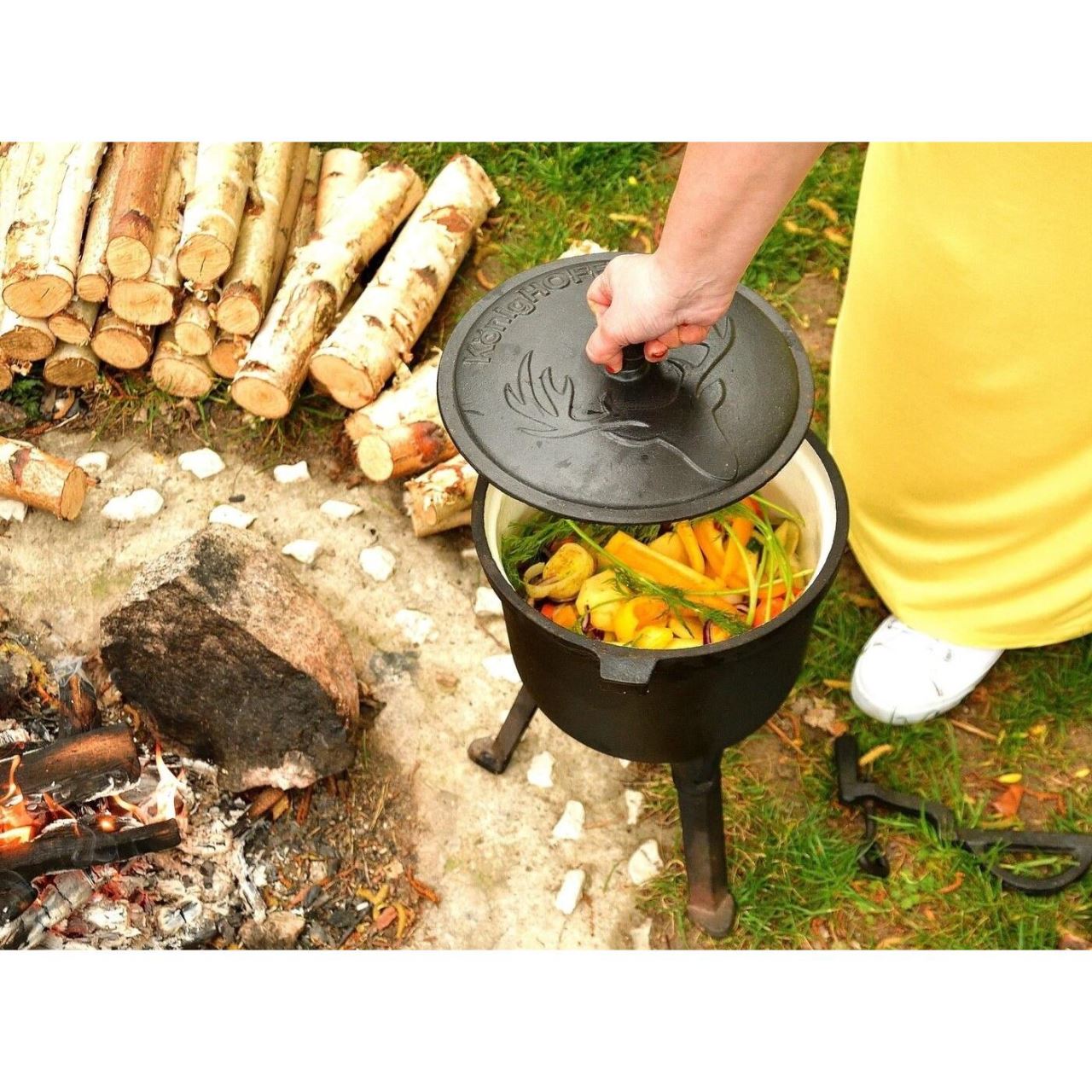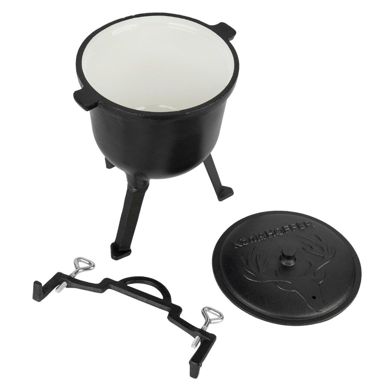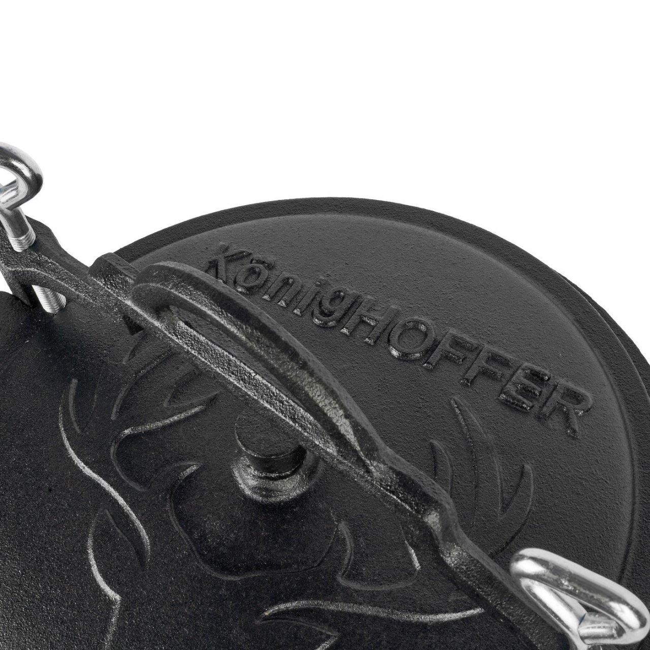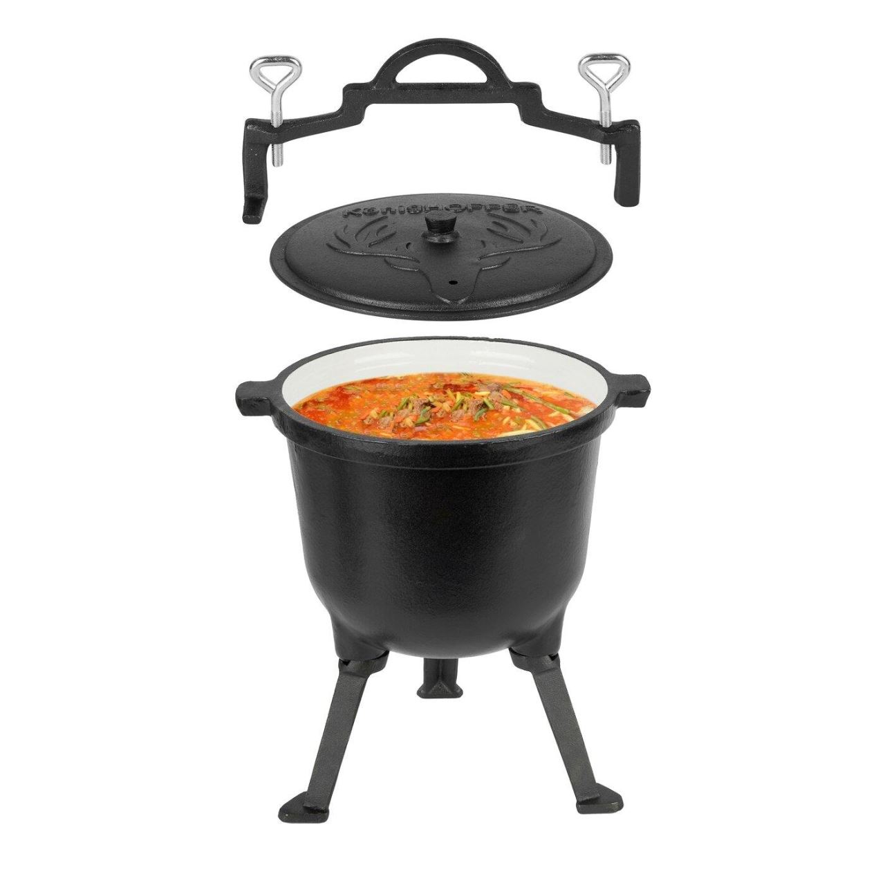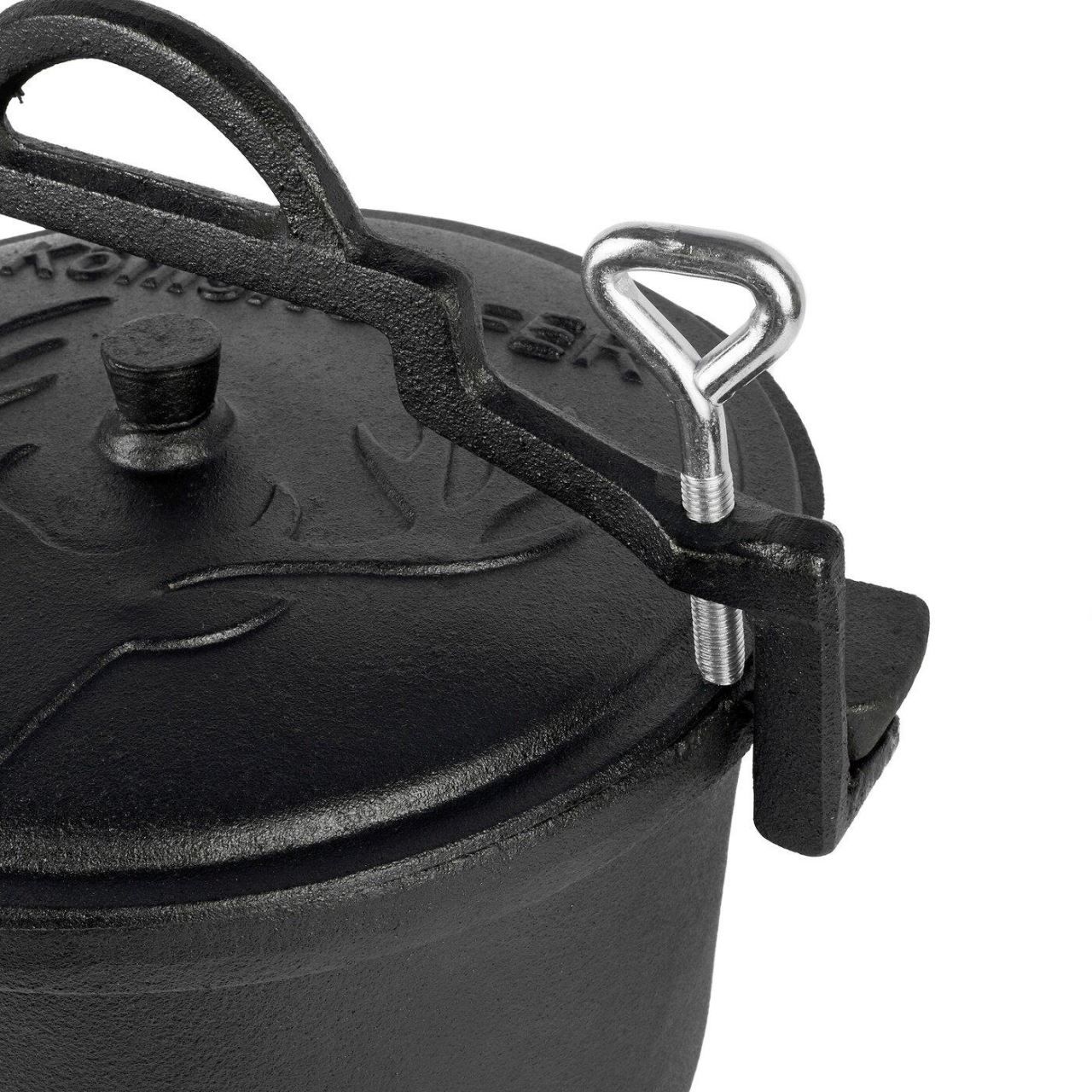 Setul include si picioare asortate care permit o fixare stabila a produsului pe sol, un capac din fonta si un maner pentru a transporta acest model sau a-l atarna peste foc.