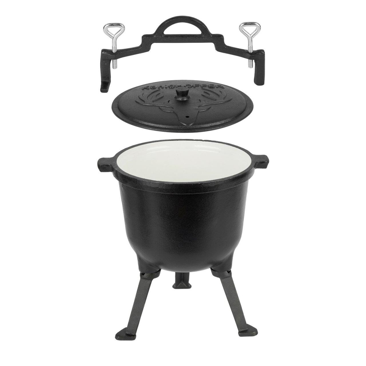 - Datorita picioarelor detasabile, ceaunul poate fi asezat pe foc, pe sobe si agatat peste vatra