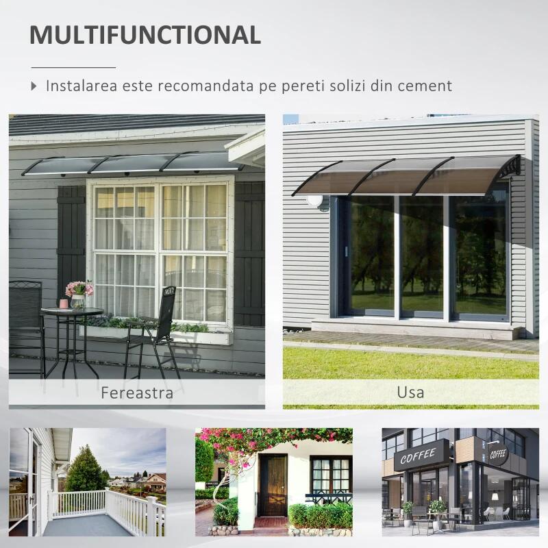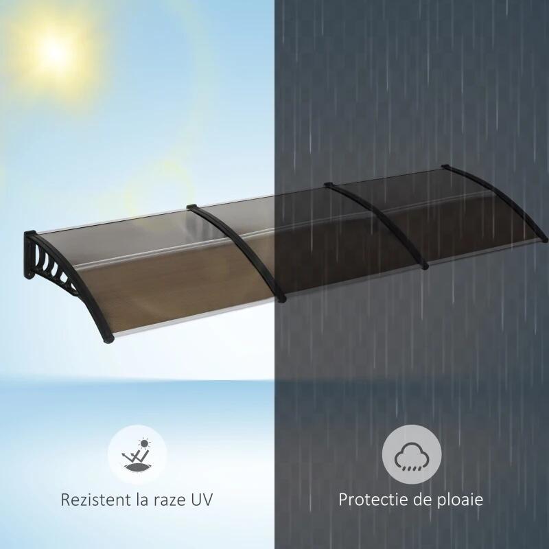 Această copertină este ideală pentru a crea o zonă protejată împotriva razelor UV, ploii sau zăpezii, asigurând în același timp o estetică plăcută în exteriorul casei dumneavoastră.