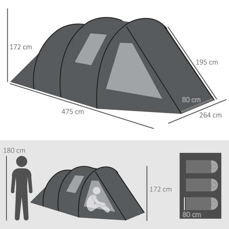 Cort camping, 3-4 persoane, impermeabil, cu vestibul, negru, 475x264x172 cm