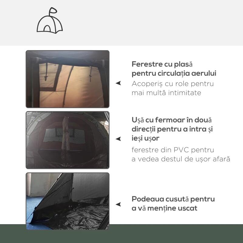 - Cortul beneficiaza inclusiv de un material cu rol de podea. Acest material pastreaza interiorul uscat in cazul in care ansamblul este instalat pe o suprafata umeda.