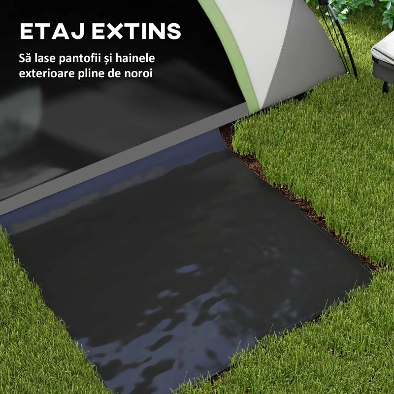 - Cortul beneficiaza inclusiv de un material cu rol de podea, cusut. Acest material pastreaza interiorul uscat in cazul in care ansamblul este instalat pe o suprafata umeda.