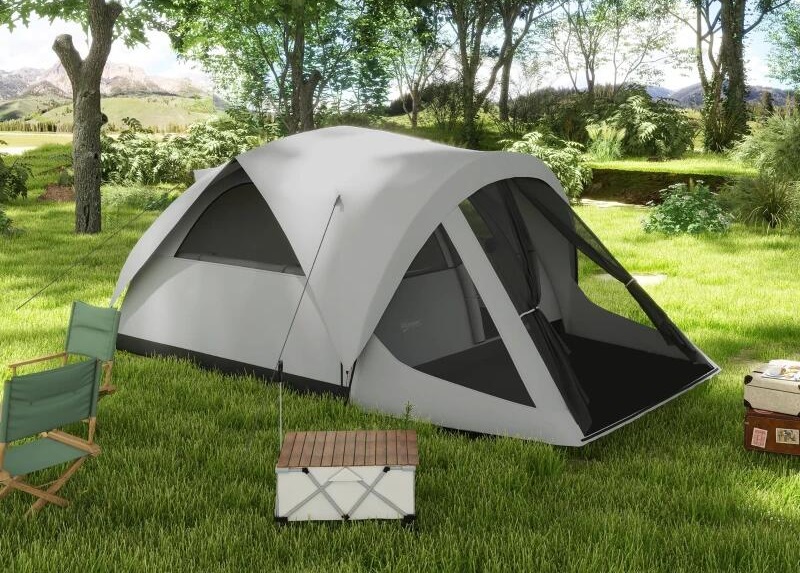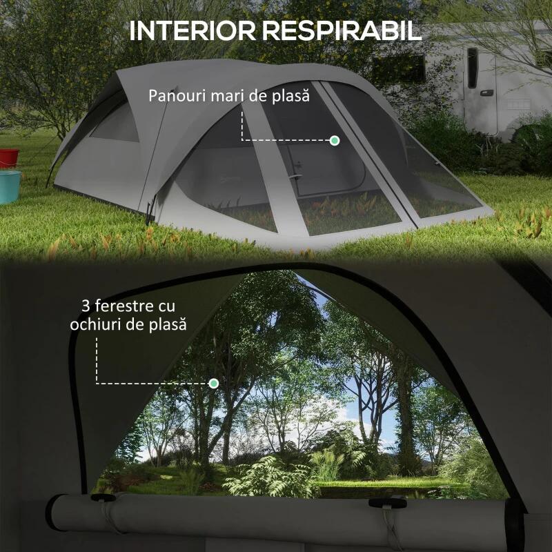 Cort camping, 4 persoane, impermeabil, cu vestibul, ferestre, geanta, gri, 430x300x190 cm