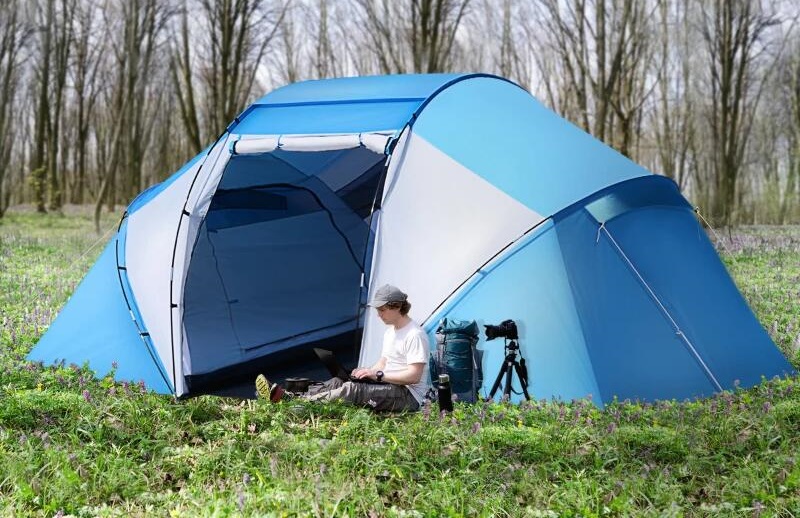 Cort camping, 6 persoane, impermeabil, cu 2 camere si vestibul, geanta, albastru si alb, 460x230x178 cm