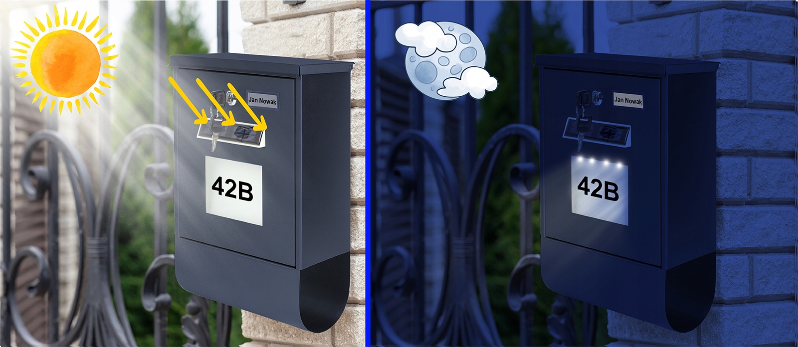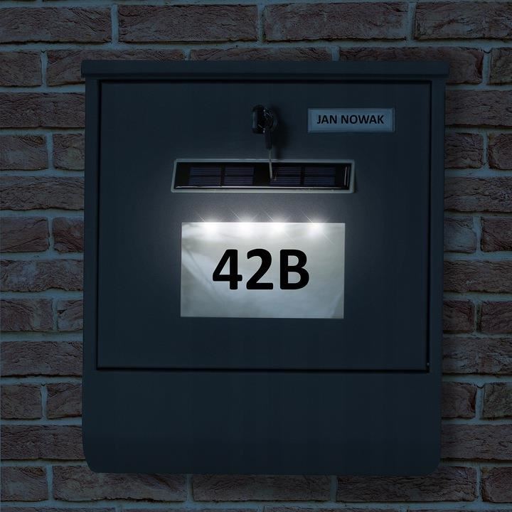 - In fata - un panou solar incarcat de soare in timpul zilei, se aprinde automat noaptea, lumineaza fereastra unde puteti lipi numarul casei.