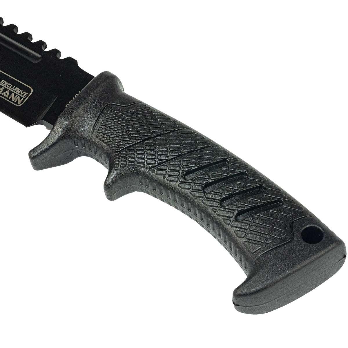 Cutit de vanatoare negru, lungime 320 mm, tip BOWIE.Un companion indispensabil în timpul fiecărei expediții sau excursii de camping.Îți oferă șansa de a supraviețui în condiții extreme de supraviețuire.Setul include un toc din material rezistent, cu buclă pentru curea.Toc cu velcro pentru a preveni căderea accidentală a cuțitului în timpul cățărării, de exemplu.Lama este acoperită cu un strat negru care protejează împotriva coroziunii și facilitează tăierea prin reducerea frecării.Mânerul conturat acoperit cu un strat anti-alunecare se potrivește perfect în mână.