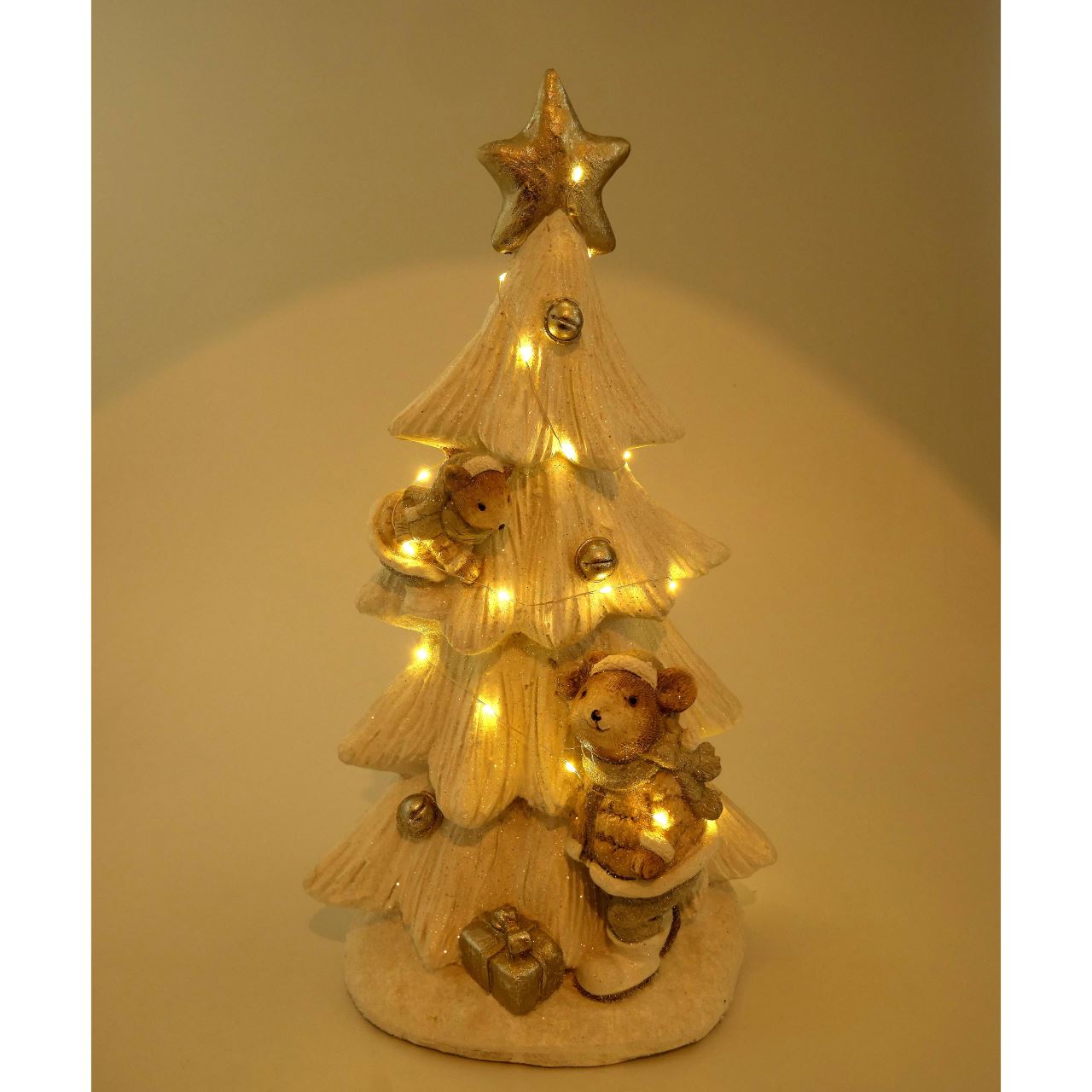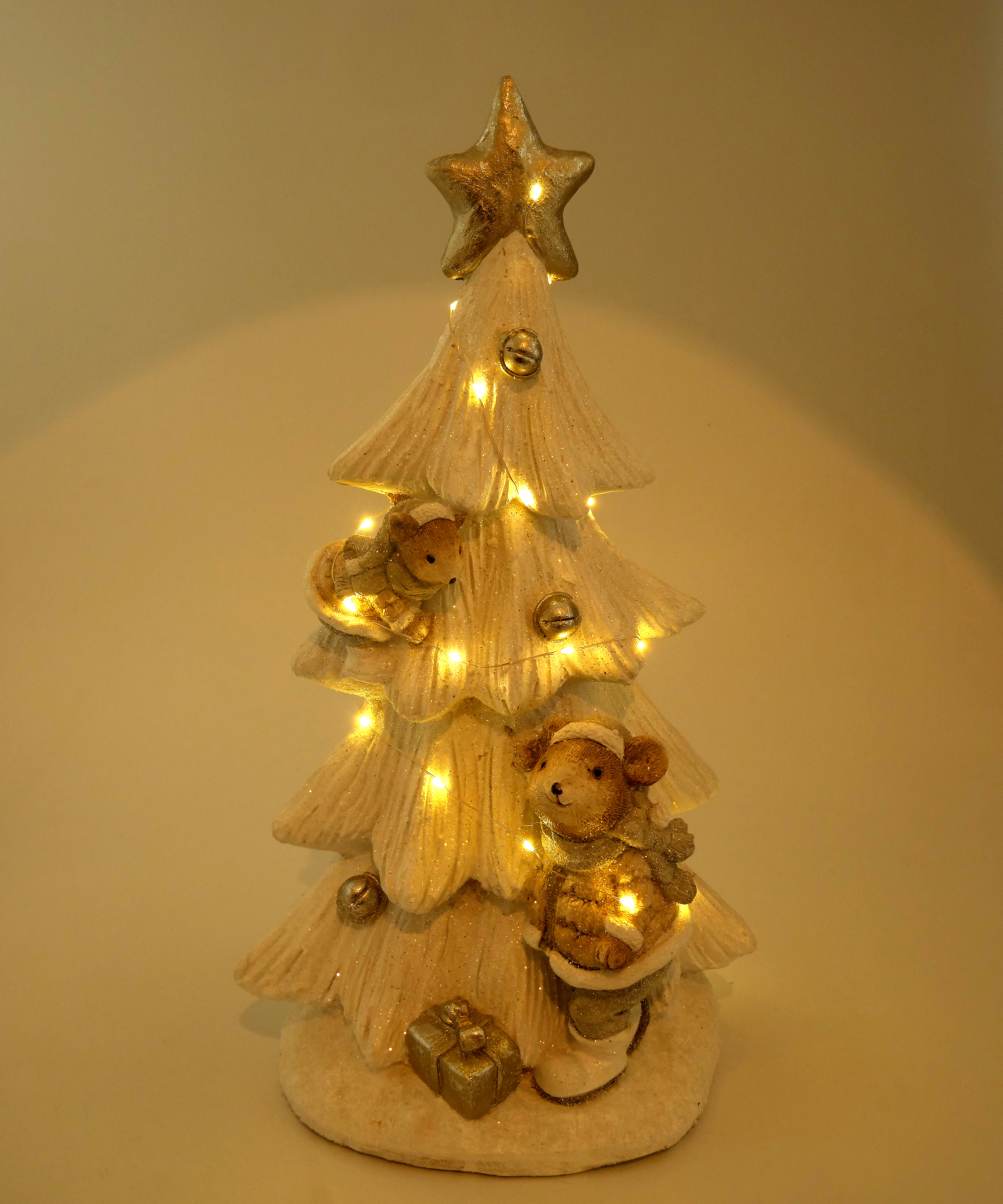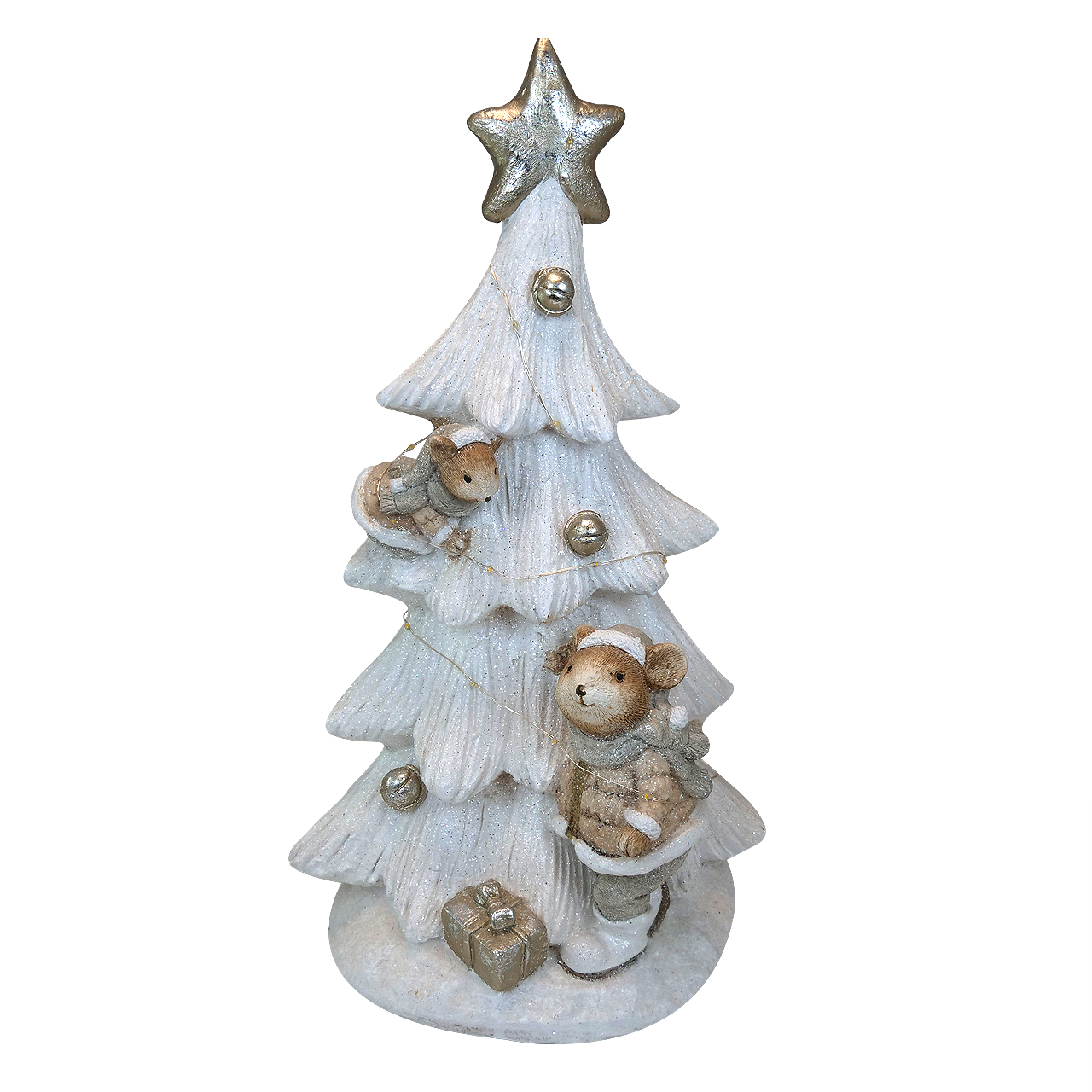 Decoratiune Craciun, brad impodobit si veverite, alb, LED, 3xAAA, 25x20x46 cm