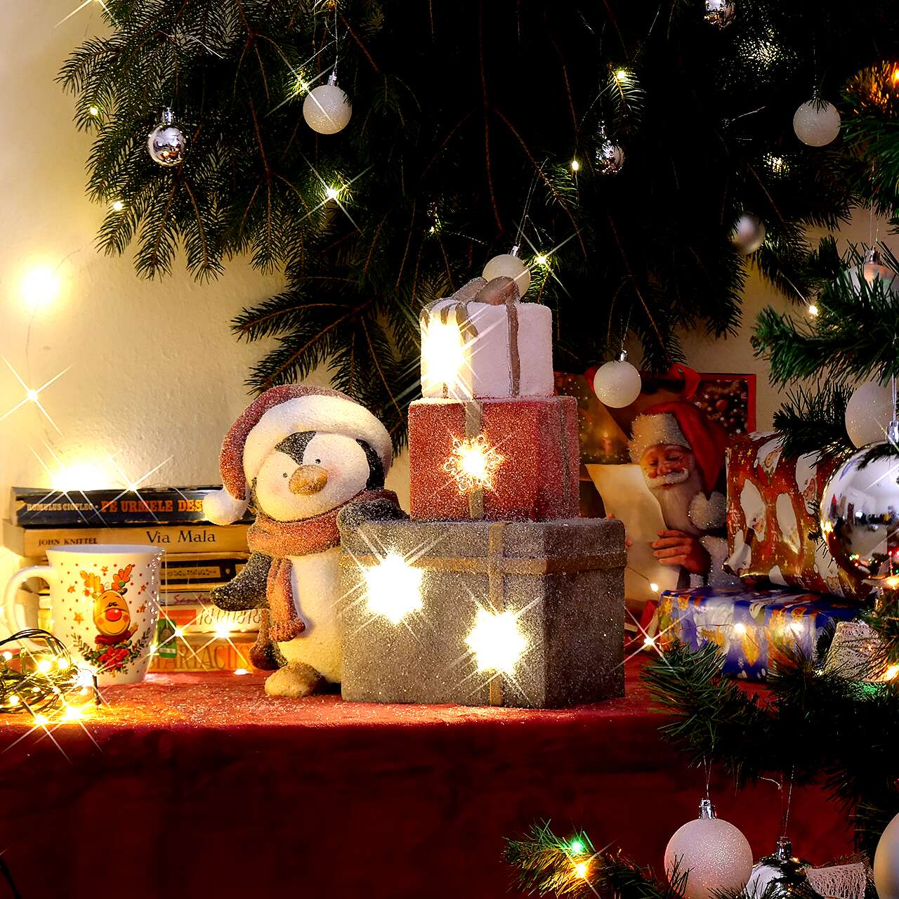 Decoratiune iarna, ceramica, pinguin si cadouri luminoase, LED, rosu si gri, 3xAAA, 29x13x33 cm, Chomik