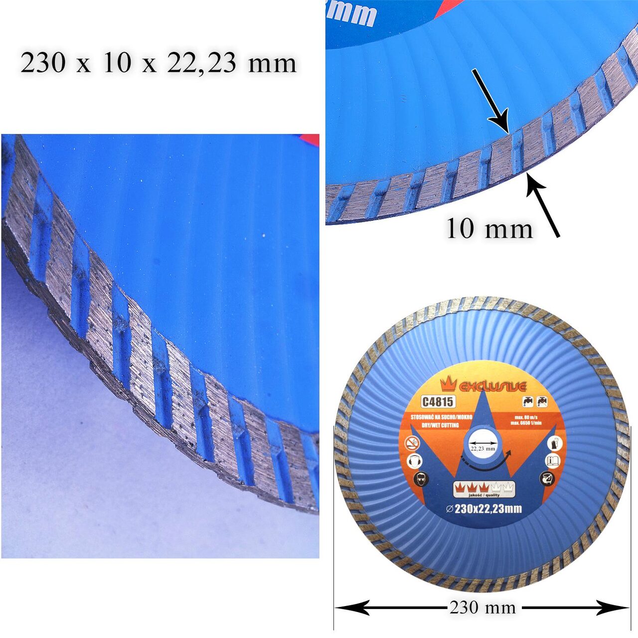 Diametrul discului este de 230 mm, grosimea este de 3,35 mm, diametrul interior este de 22,23 mm si suprafata diamantata este de 10 mm.