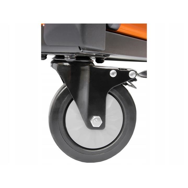 Contine blat de masa din polipropilena, doua roti pivotante si doua roti echipate cu frana.