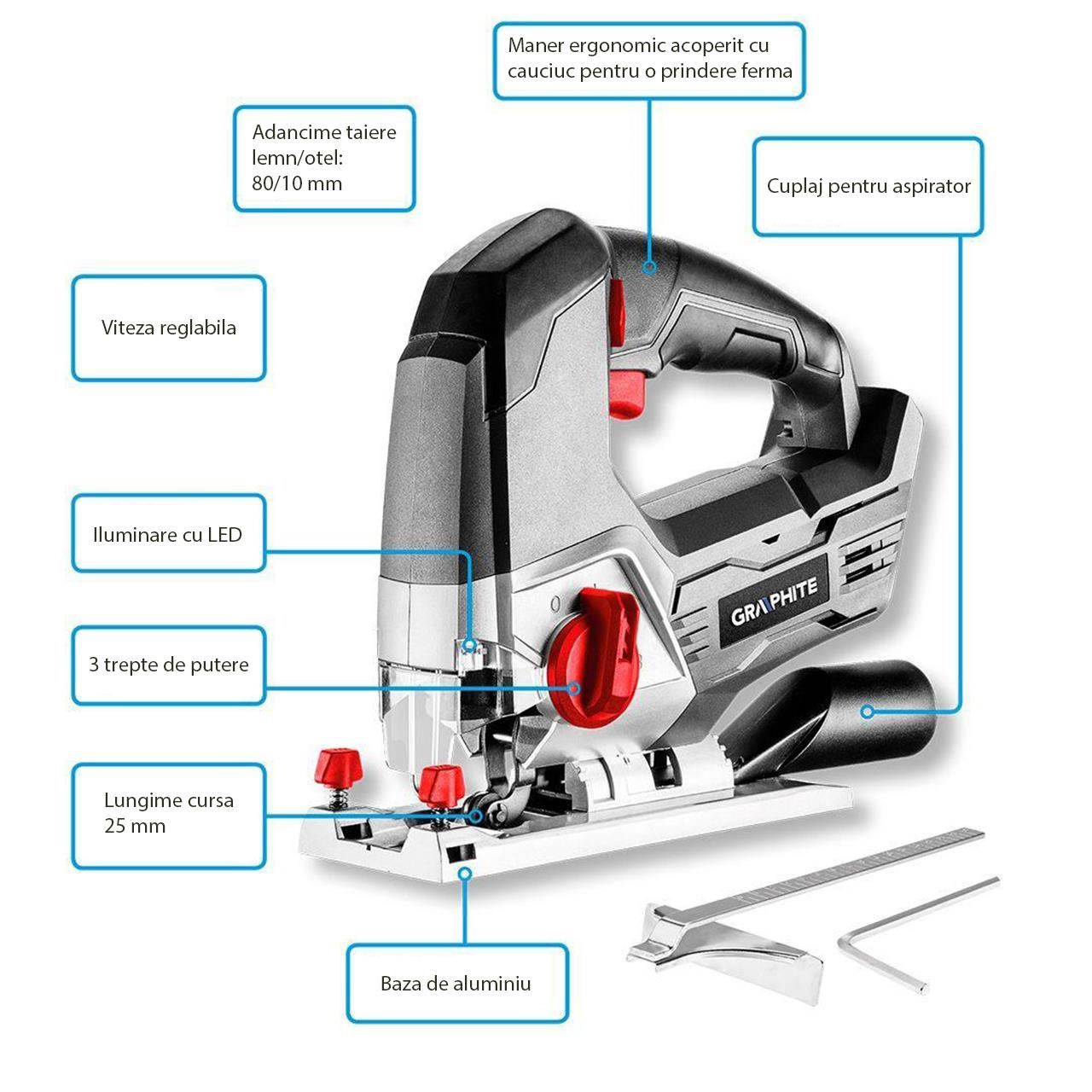 Este conceput pentru taierea rapida si precisa a lemnului si metalului, cu o grosime maxima de 80 mm, respectiv 10 mm.