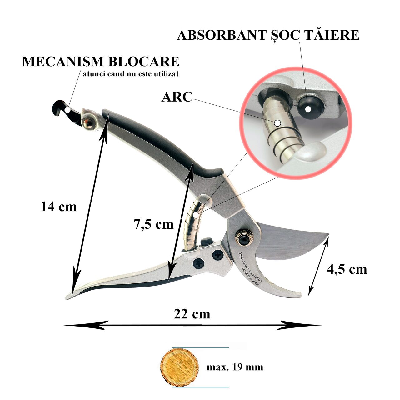 - Poate taia ramuri cu o grosime de pana la 19 mm.