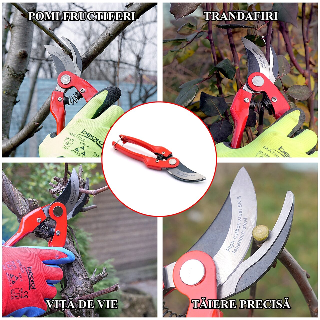 Foarfeca cu lama dreapta - este folosita pentru a taia ramuri mai subtiri si mai moi, cum ar fi cele de la arbusti sau flori. Lama dreapta asigura o taiere precisa si curata.