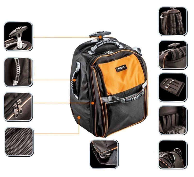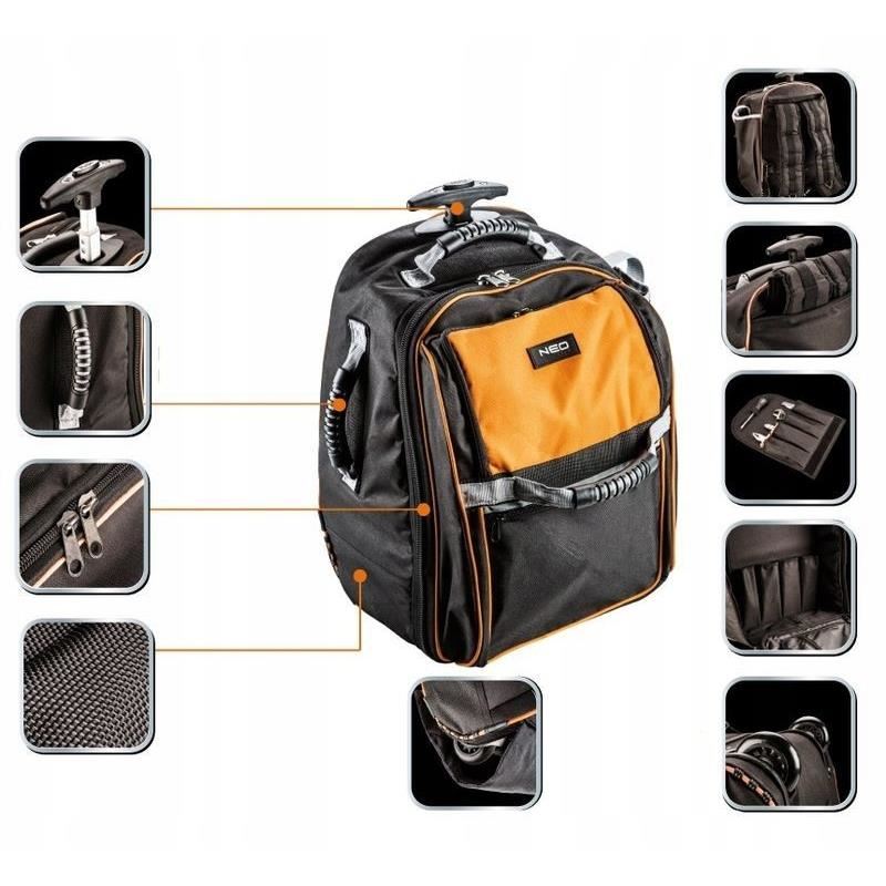 Geanta de scule tip troler de la NEO este confectionata din poliester rezistent 600 D, asigurand durabilitatea acesteia pe termen lung.