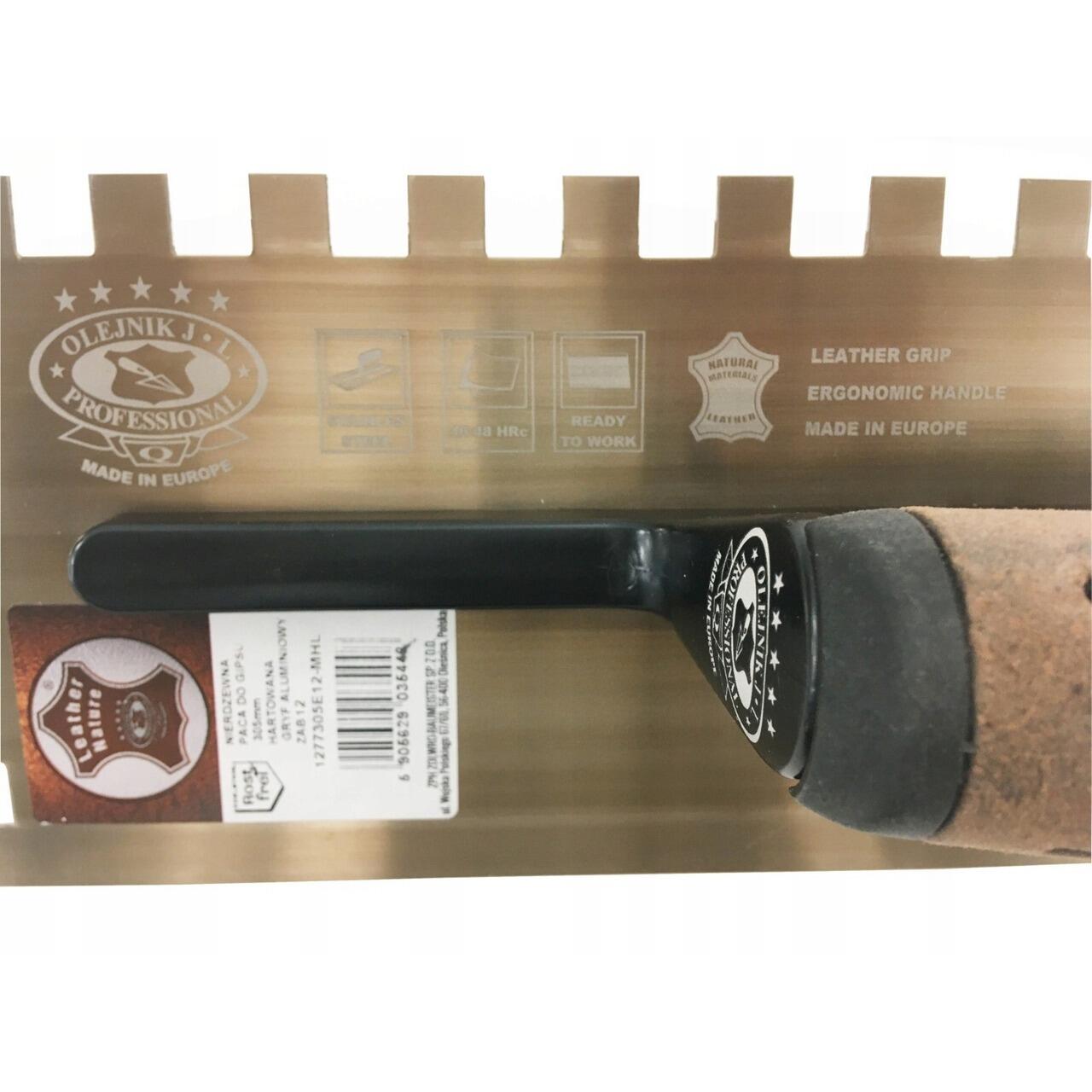 Gletiera inox, intarita, cu zimti 12x12, Premium Gold, 35.6x12 cm x 0.65 mm, maner piele Alcantara, Olejnik