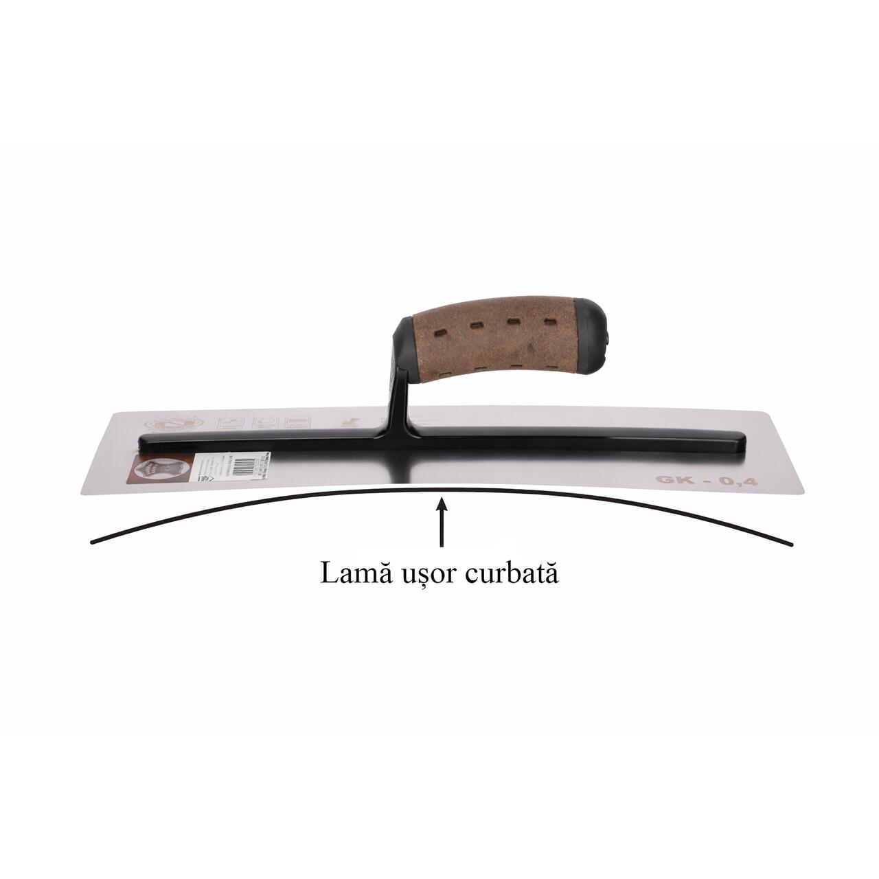 Curbura lamei reprezinta un avantaj important in procesul de finisare a stratului de glet aplicat pe imbinarile placilor de gips-carton, deoarece permite o distribuire mai uniforma a materialului si o presiune controlata pe suprafata. Datorita formei sale special concepute, lama se adapteaza mai bine la zona imbinarilor, facilitand intinderea gletului intr-un strat subtire si uniform, fara acumulari excesive pe margini. Astfel, se reduce necesitatea slefuirii ulterioare si se obtine o suprafata neteda, pregatita pentru etapele finale de finisare. Aceasta curbura ajuta, de asemenea, la o manevrare mai precisa a uneltei, contribuind la cresterea eficientei si calitatii lucrarii.