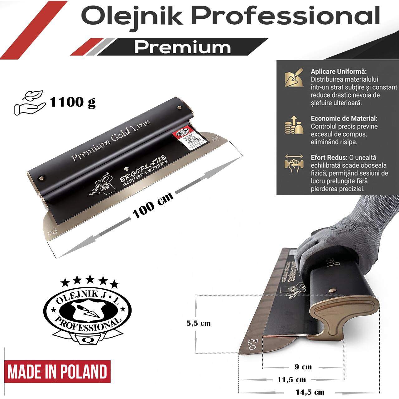 Gletiera profesionala, maner aluminiu, lama inox 0.3 mm, Premium Gold, Super Flex, 100 cm, Ergoplane, Olejnik