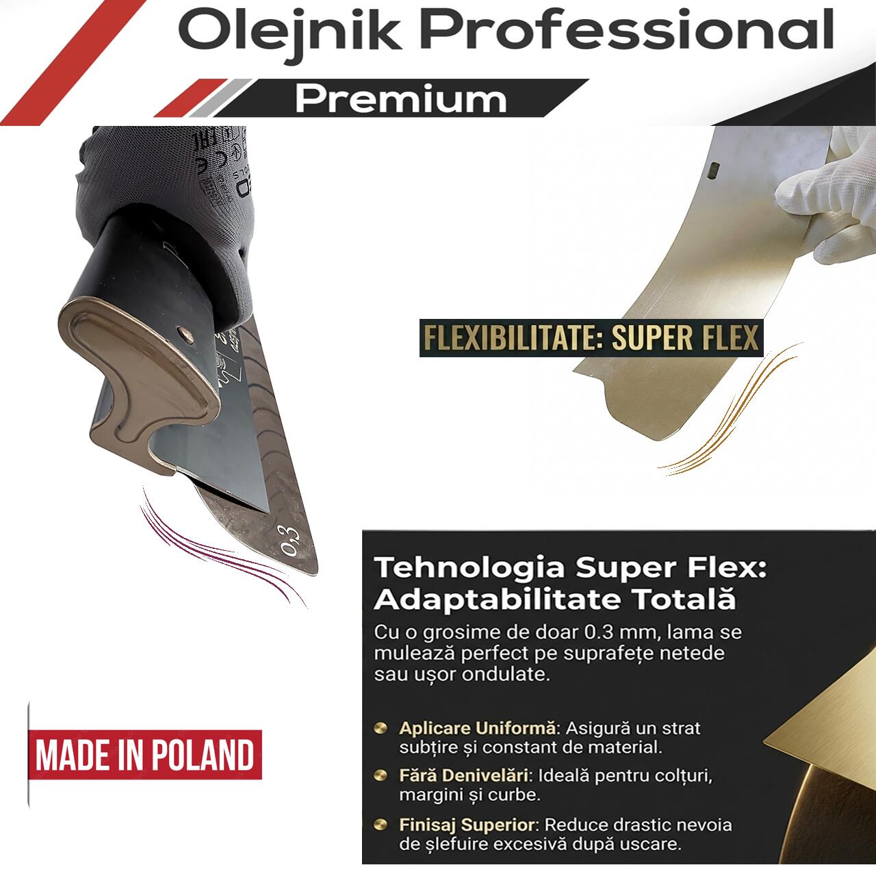 - Finisaj impecabil: Cu grosimea lamei de 0.3 mm (Super Flex), se muleaza perfect pe suprafata, asigurand un strat uniform si fara urme