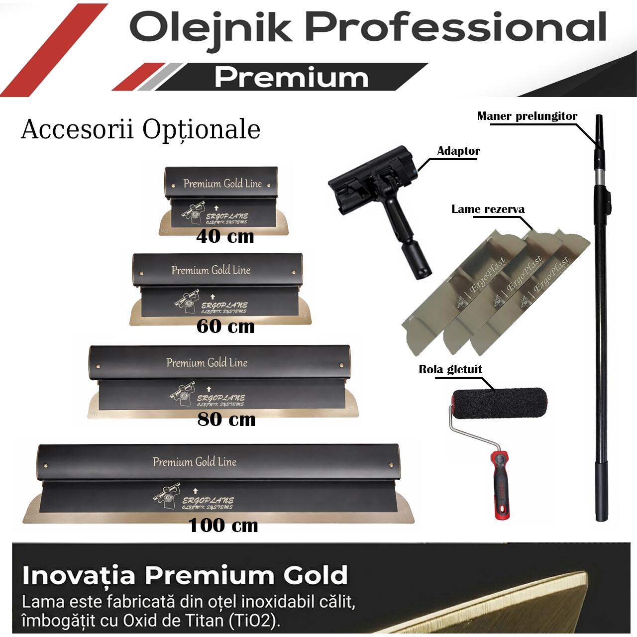 Gletiera profesionala, maner aluminiu, lama inox 0.3 mm, Premium Gold, Super Flex, 80 cm, Ergoplane, Olejnik