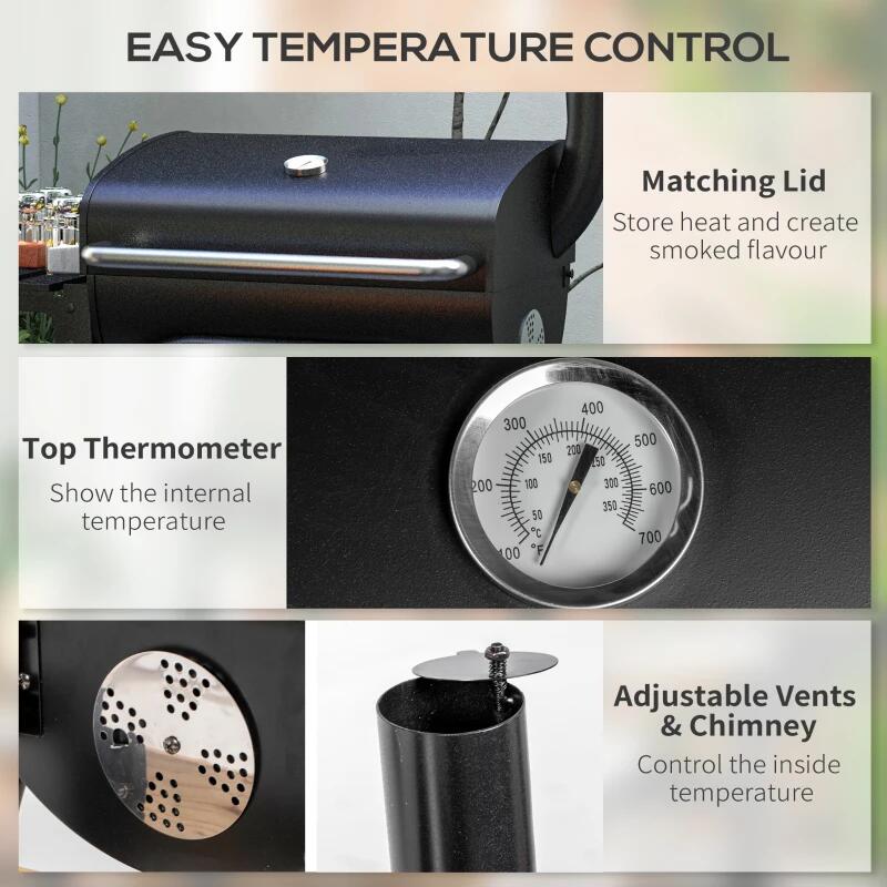 - Capacul incorporat economiseste caldura. Gurile de aerisire reglabile si cosul de fum controleaza focul, iar termometrul situat pe capac indica in mod clar schimbarile de temperatura interna.