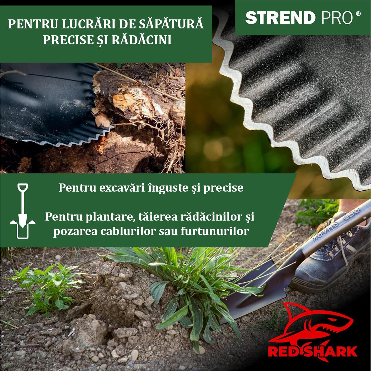 - Lama cu varf zimtat special ascutit este potrivita pentru santuri inguste, drenaj si excavatii de radacini. Aceasta a fost realizata din otel carbon, un material de inalta calitate care garanteaza durabilitate in timp.