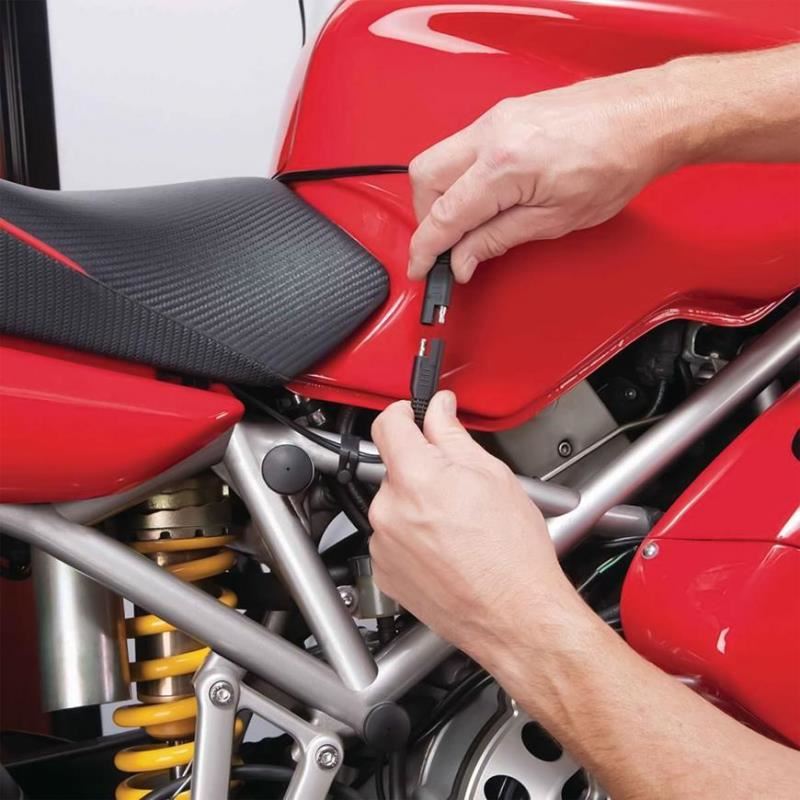 Incarcatorul este echipat cu un cablu de conectare cu un conector tip SAE de 1.2 m, doua cabluri de incarcare conectabile de 0.4 m si trei sigurante.