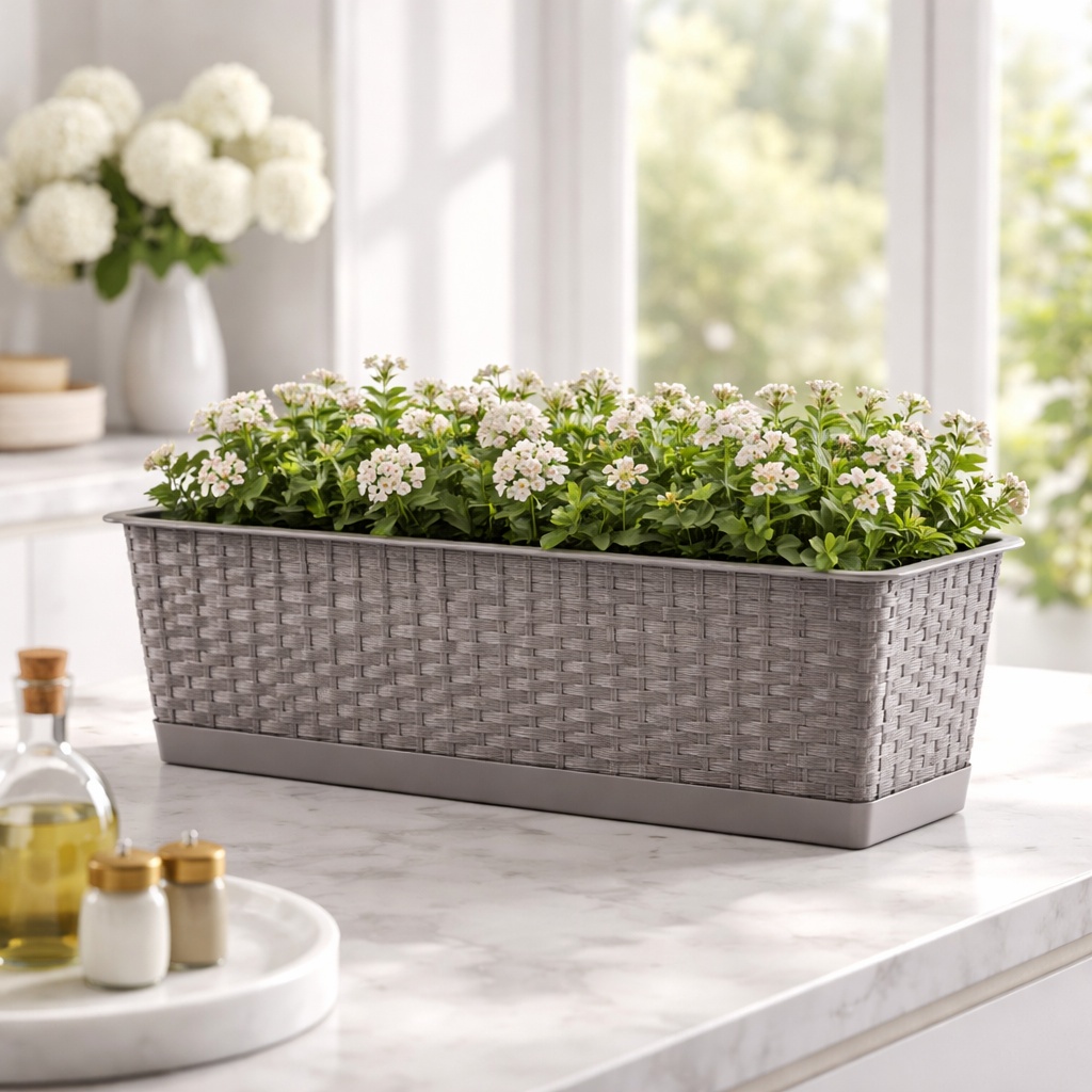 Finisaj Ratan Premium: Textura impletita ofera un joc de lumini si umbre care confera vasului un aspect tridimensional, mult mai pretios decat al jardinierelor clasice din plastic neted.