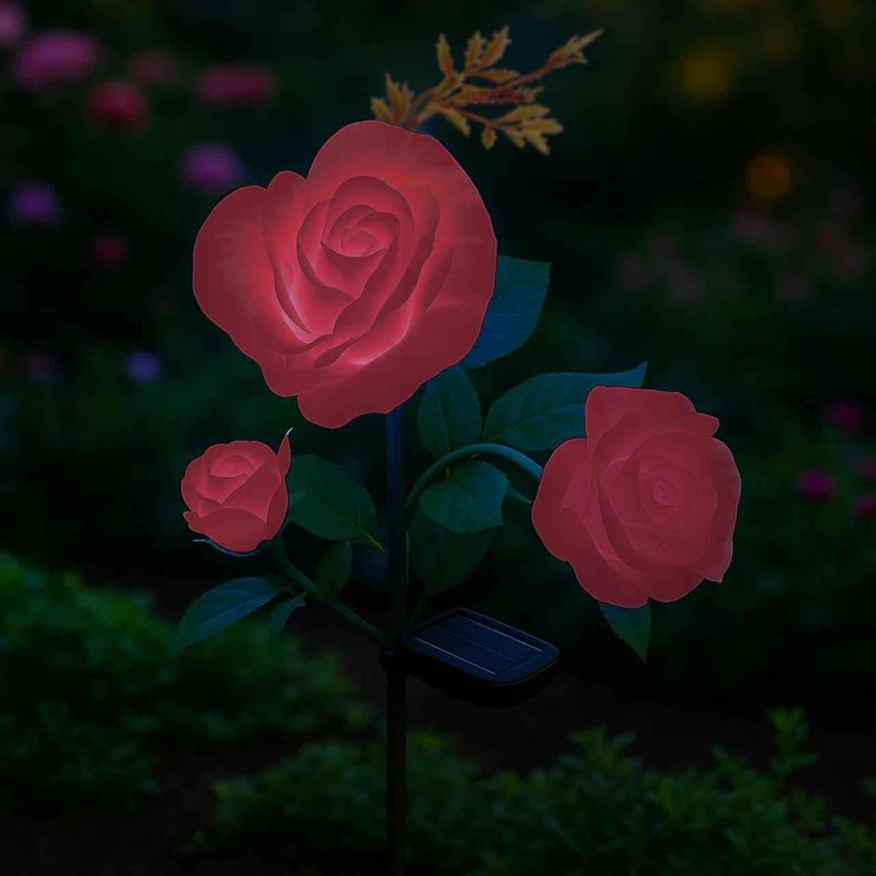 - Forma de trandafir cu trei flori aduce un plus de naturalete in decor, fiind aproape imposibil de distins de o floare reala in timpul zilei. Poate fi asezata in straturi de flori, langa alei, in ghivece sau langa foisor, integrandu-se perfect in peisaj. Pe timp de noapte, insa, adevarata magie incepe: cele trei flori incep sa lumineze discret, schimbandu-si treptat culorile – rosu, verde, albastru, mov si galben si creand un spectacol vizual calm si relaxant. Cand sunt complet incarcate, LED-urile stralucesc continuu pana la 10 ore.