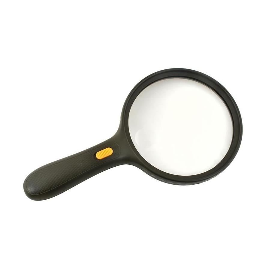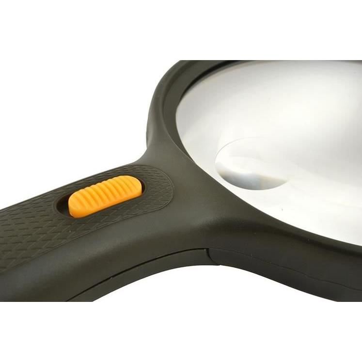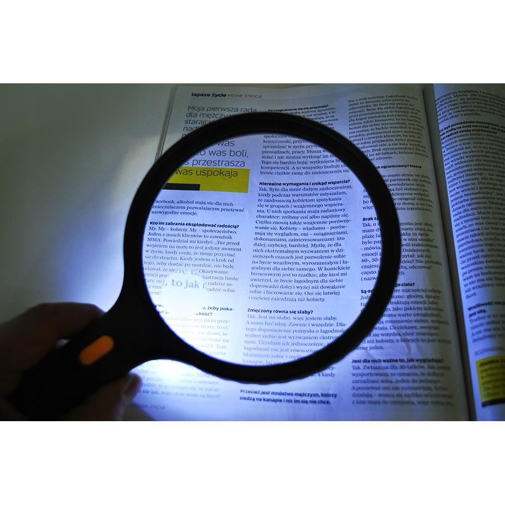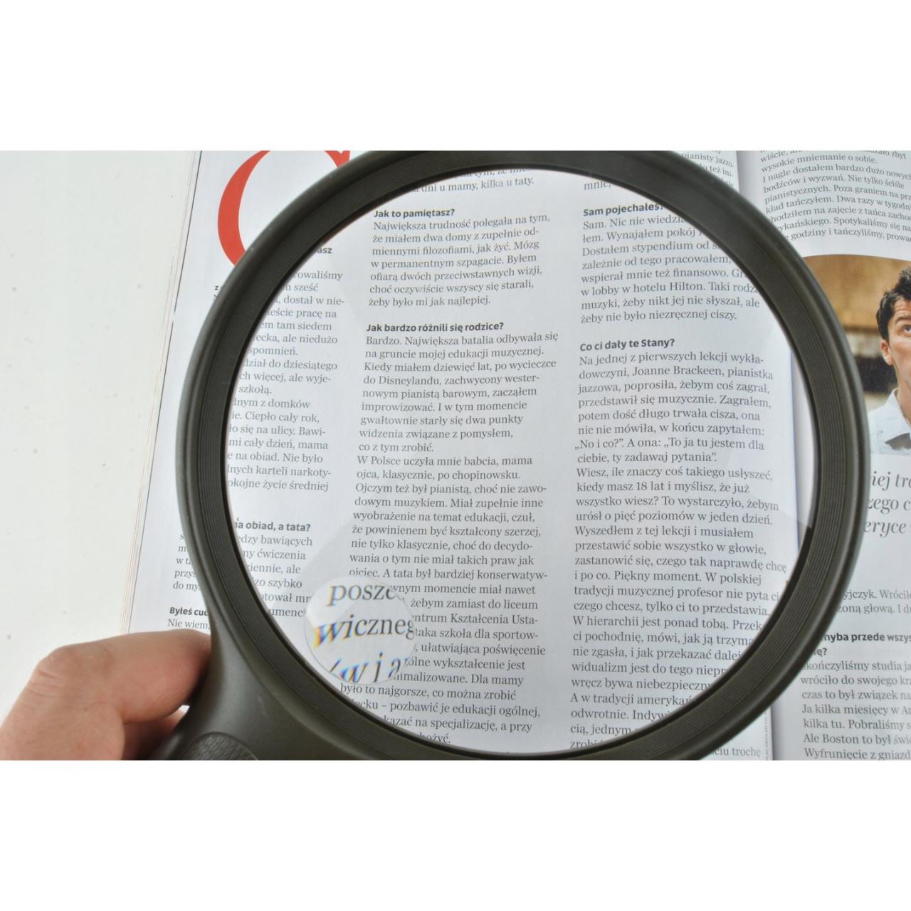 Diametrul lentilei va permite sa mariti o cantitate mare de text fara a fi nevoie sa mutati intens lupa peste imaginea marita. Marirea suplimentara este posibila datorita unei lentile suplimentare, mai mici, situate in sticla principala. Lupa are si propria sursa de lumina sub forma a trei LED-uri. Sunt activate de un comutator situat pe maner si lumina emisa de acestea cade direct sub lentila.