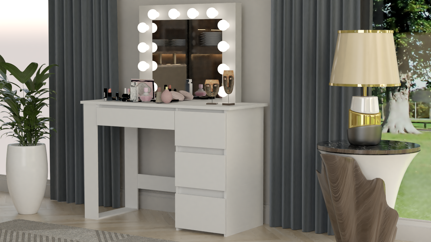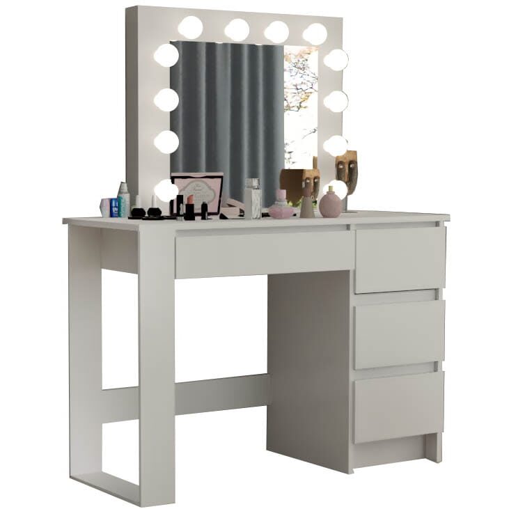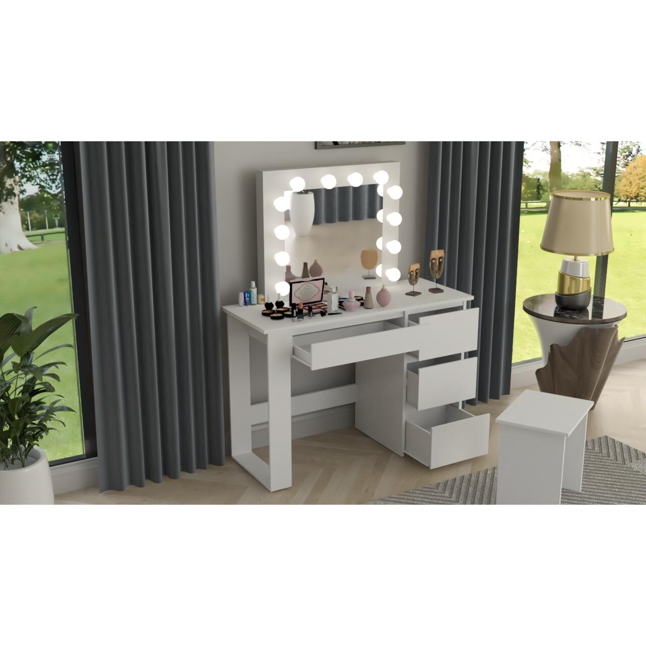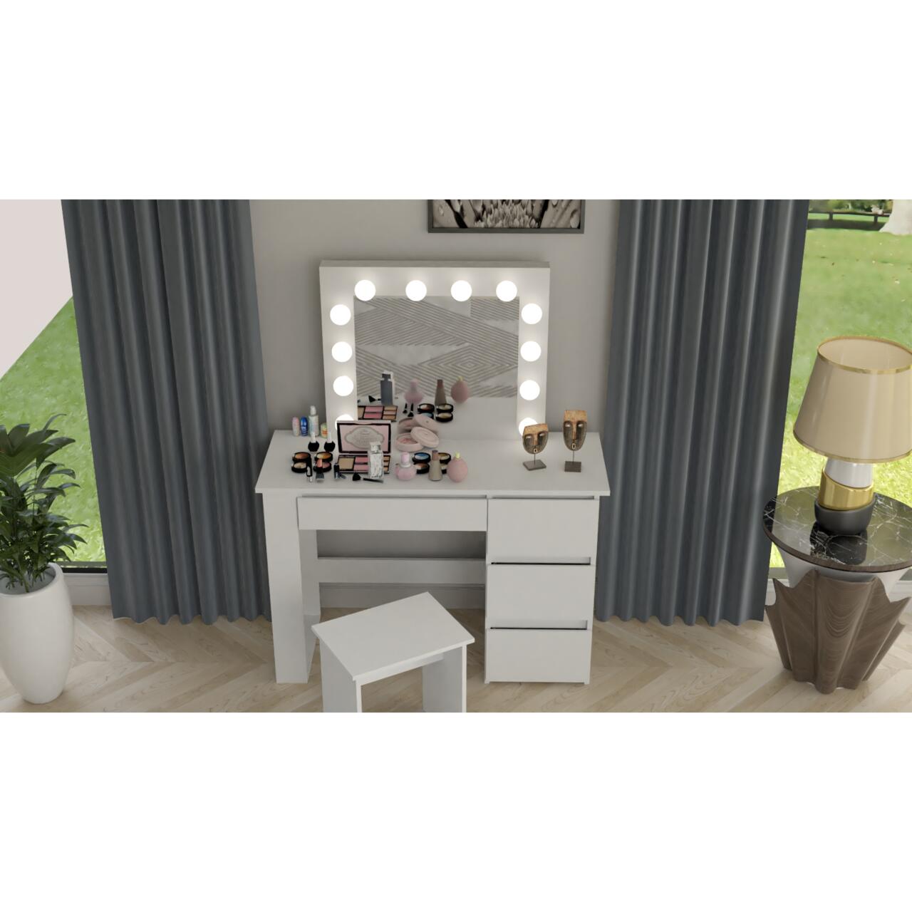 - Este o piesa de mobilier eleganta si practica, proiectata pentru a satisface nevoile si preferintele persoanelor care cauta un spatiu dedicat pentru a-si ingriji frumusetea si a-si stoca cosmeticele si bijuteriile. Aceasta masa este prevazuta cu o oglinda mare si 12 lumini LED incorporate, ceea ce o face ideala pentru aplicarea machiajului sau coafurii.