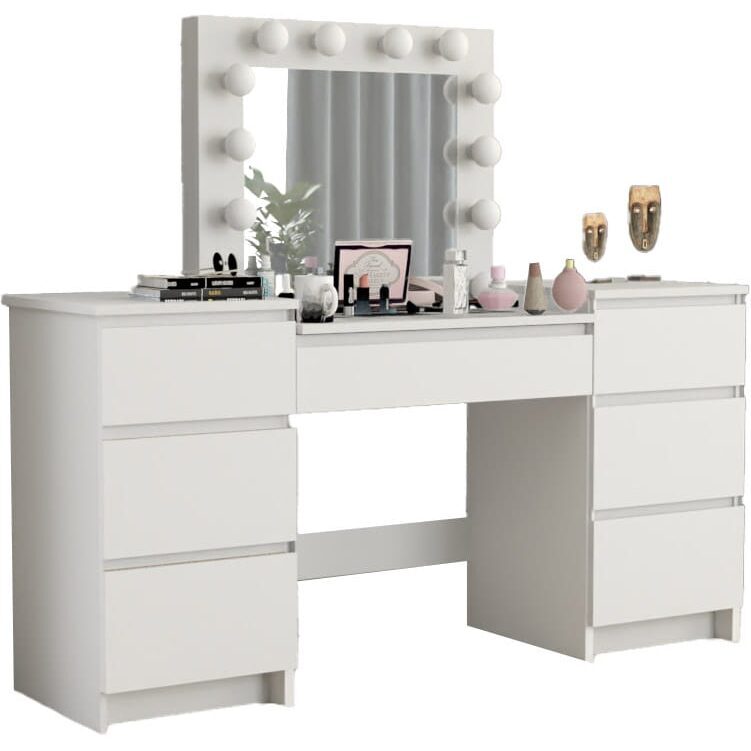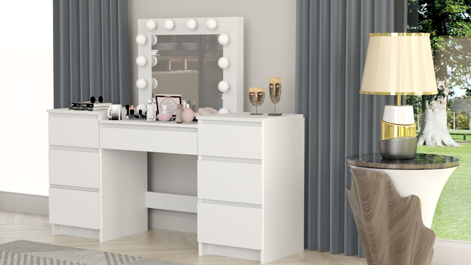 - Masa este dotata cu multiple compartimente de depozitare care ajuta la organizarea si protejarea obiectelor de pret. Este echipata cu cate 3 sertare mici in fiecare parte si un sertar mare pe mijloc, sub oglinda.