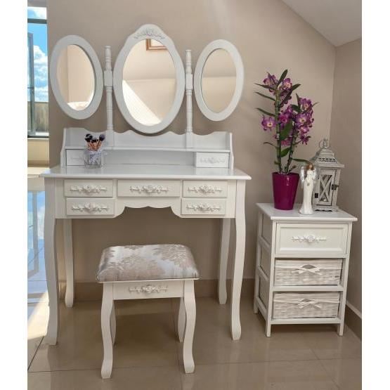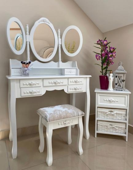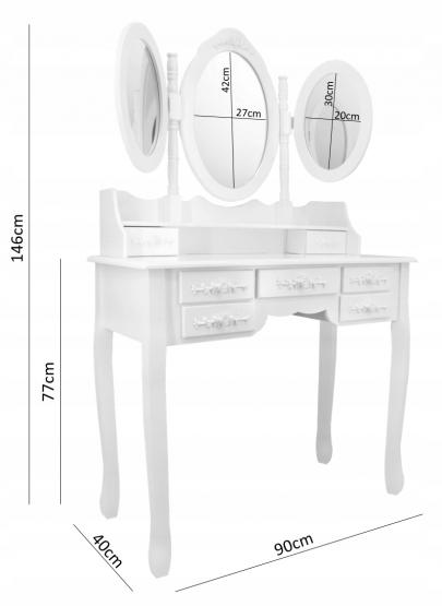 Masa de toaleta/machiaj, alba, cu 3 oglinzi si taburet, 90x40x146 cm, Vintage