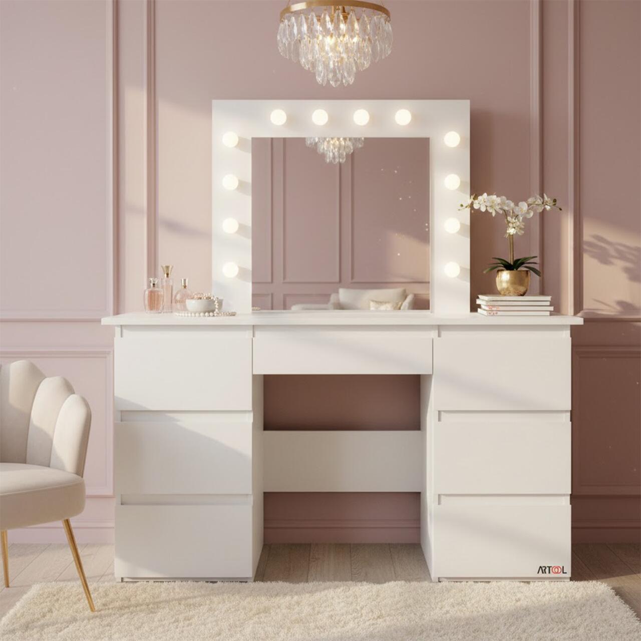 Aceasta masa este prevazuta cu o oglinda mare si 12 becuri LED incorporate, ceea ce o face ideala pentru aplicarea machiajului sau coafurii.