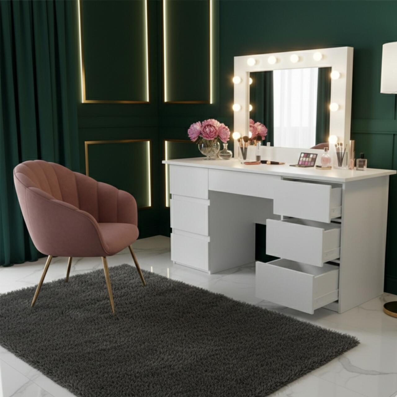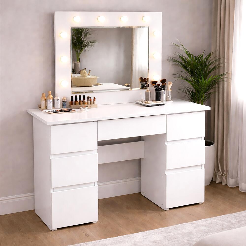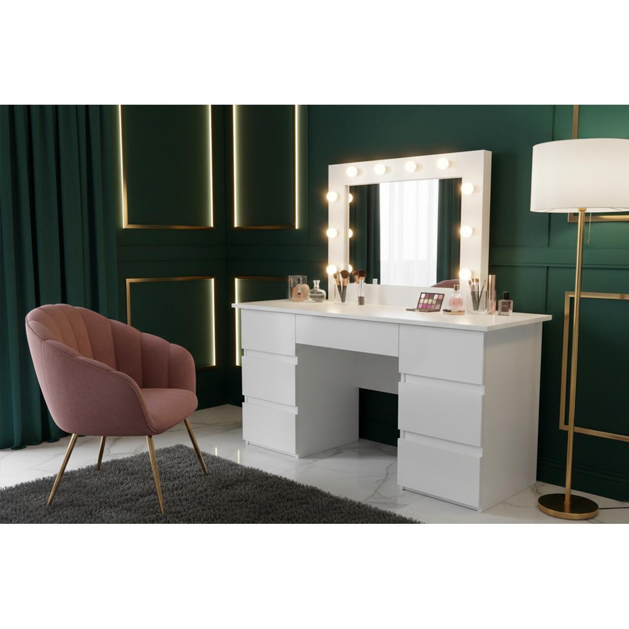 Aceasta masa este prevazuta cu o oglinda mare si 10 becuri LED incorporate, ceea ce o face ideala pentru aplicarea machiajului sau coafurii.