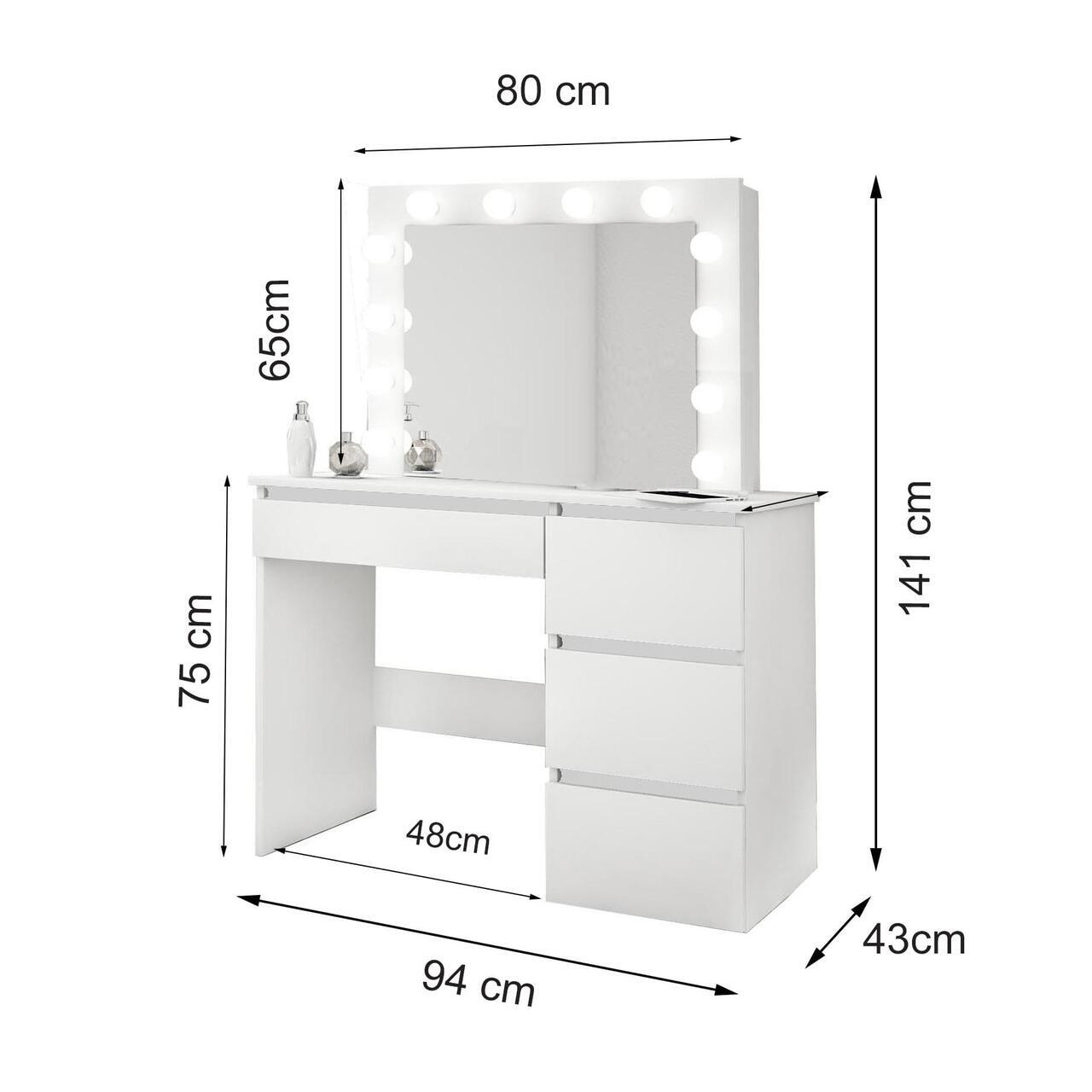 - Este o piesa de mobilier eleganta si practica, proiectata pentru a satisface nevoile si preferintele persoanelor care cauta un spatiu dedicat pentru a-si ingriji frumusetea si a-si stoca cosmeticele si bijuteriile. Aceasta masa este prevazuta cu o oglinda mare si 12 lumini LED incorporate, ceea ce o face ideala pentru aplicarea machiajului sau coafurii.