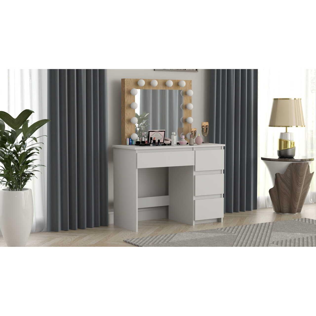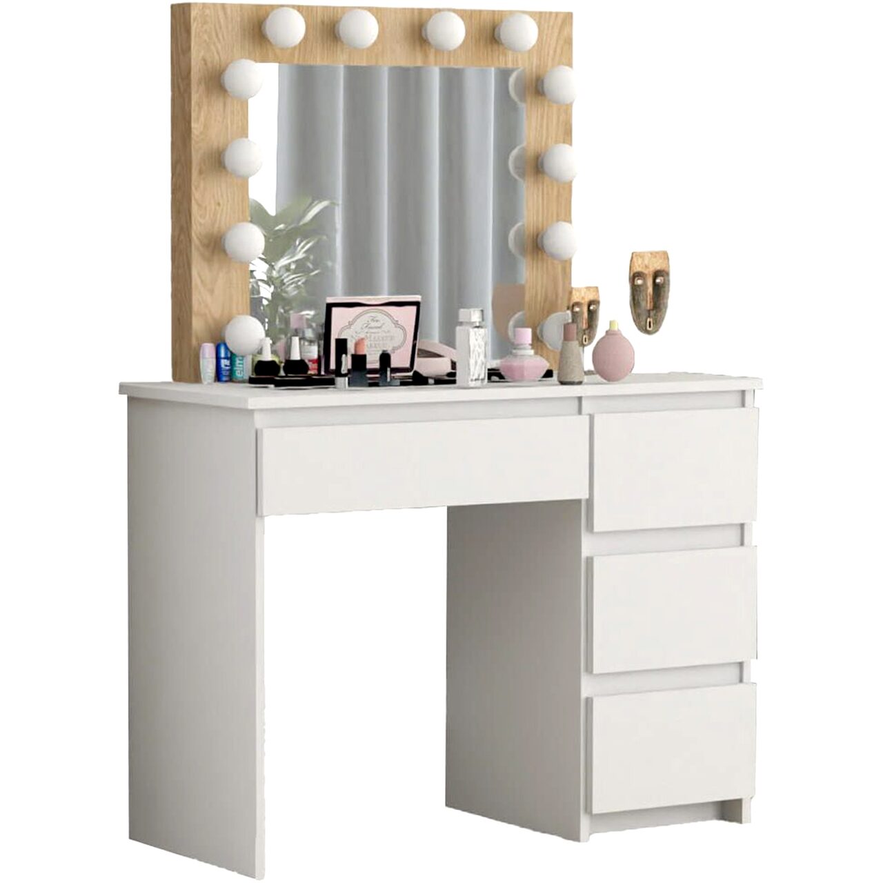 Masa de toaleta/machiaj, alba, cu oglinda stejar Wotan si LED-uri, Irina, 94x43x141 cm