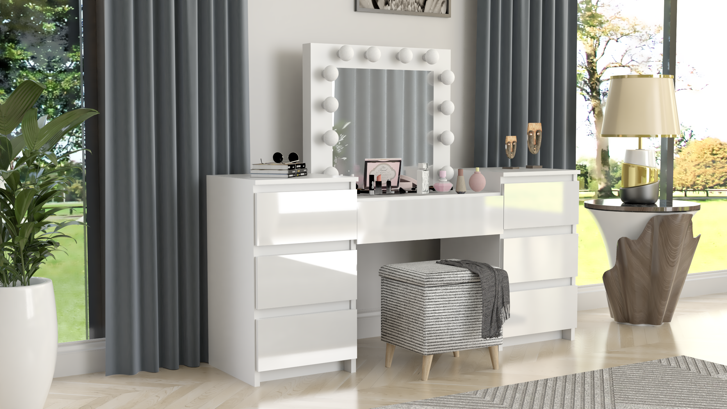 - Este o piesa de mobilier eleganta si practica, proiectata pentru a satisface nevoile si preferintele persoanelor care cauta un spatiu dedicat pentru a-si ingriji frumusetea si a-si stoca cosmeticele si bijuteriile. Aceasta masa este prevazuta cu o oglinda mare si 12 lumini LED incorporate, ceea ce o face ideala pentru aplicarea machiajului sau coafurii.