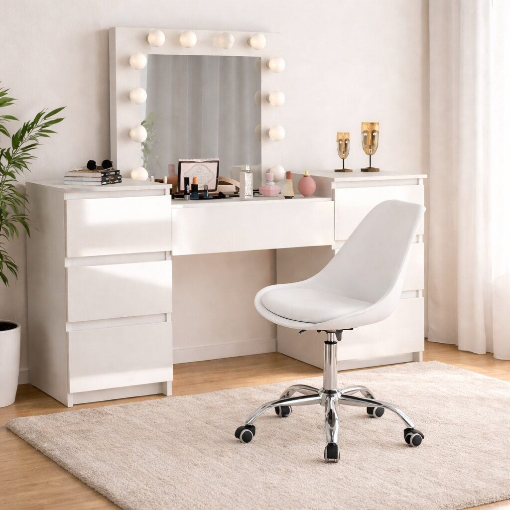 - Este o piesa de mobilier eleganta si practica, proiectata pentru a satisface nevoile si preferintele persoanelor care cauta un spatiu dedicat pentru a-si ingriji frumusetea si a-si stoca cosmeticele si bijuteriile. Aceasta masa este prevazuta cu o oglinda mare si 12 lumini LED incorporate, ceea ce o face ideala pentru aplicarea machiajului sau coafurii.