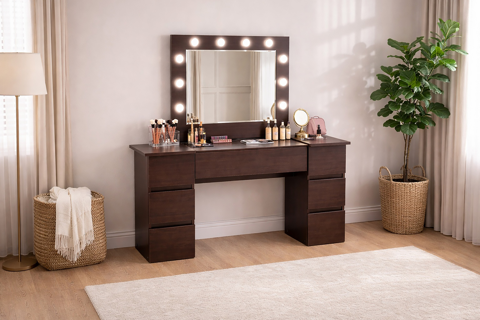 - Spatiu de depozitare generos: Cele 6 sertare mici si un sertar mare, central, permit organizarea eficienta a cosmeticelor si bijuteriilor