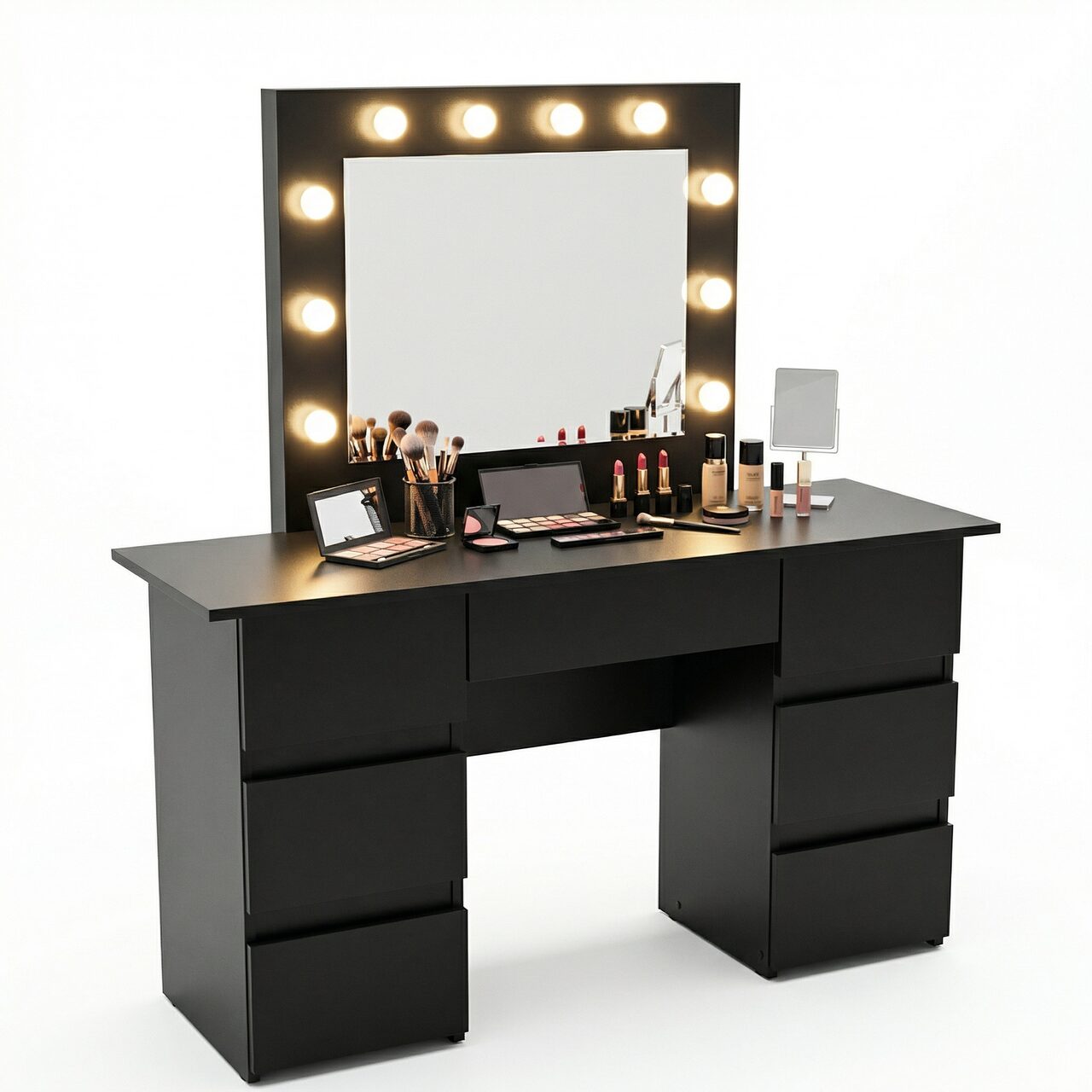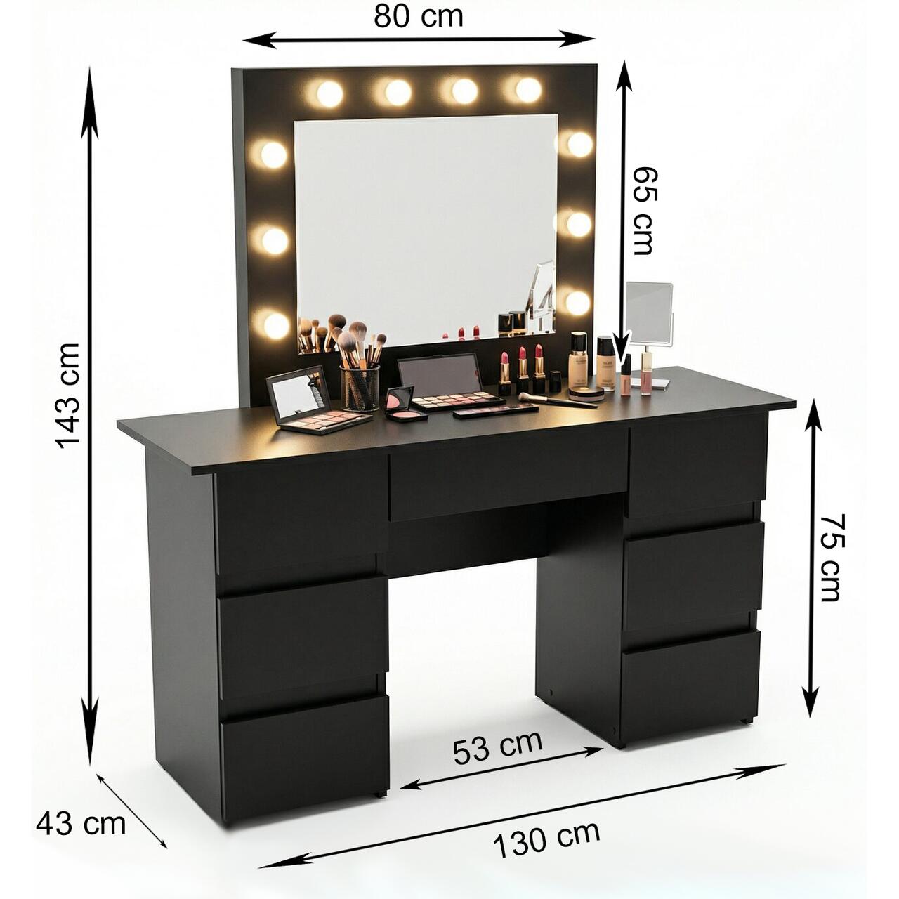 Aceasta masa este prevazuta cu o oglinda mare si 10 becuri LED incorporate, ceea ce o face ideala pentru aplicarea machiajului sau coafurii.
