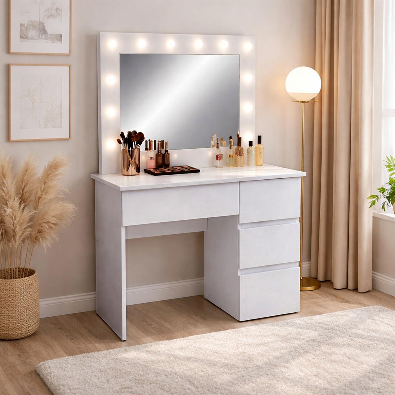 Depozitare eficienta: Cele 4 sertare spatioase iti permit sa iti organizezi produsele preferate, astfel incat totul sa fie la indemana si ordonat. Oglinda mare integrata completeaza perfect zona de machiaj.