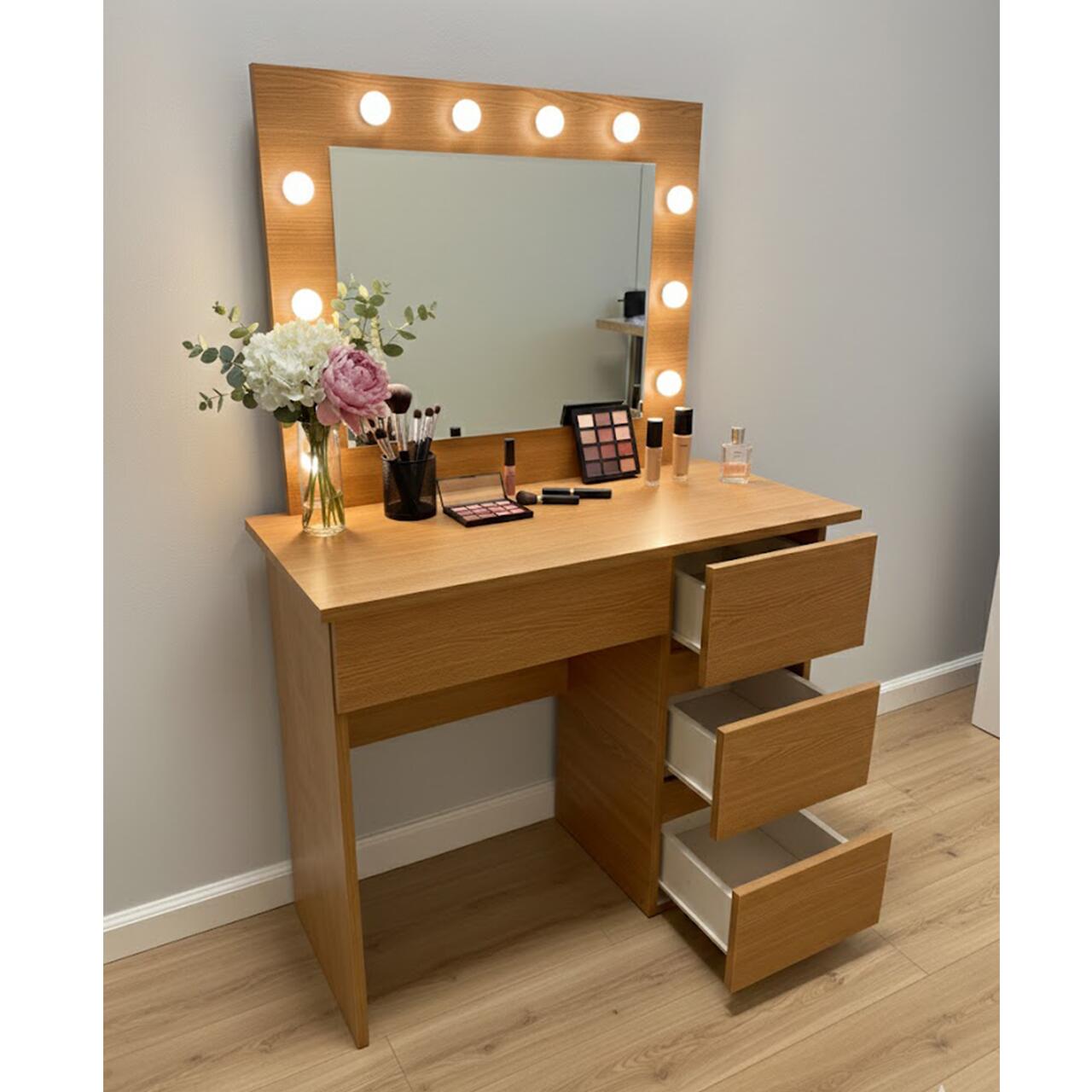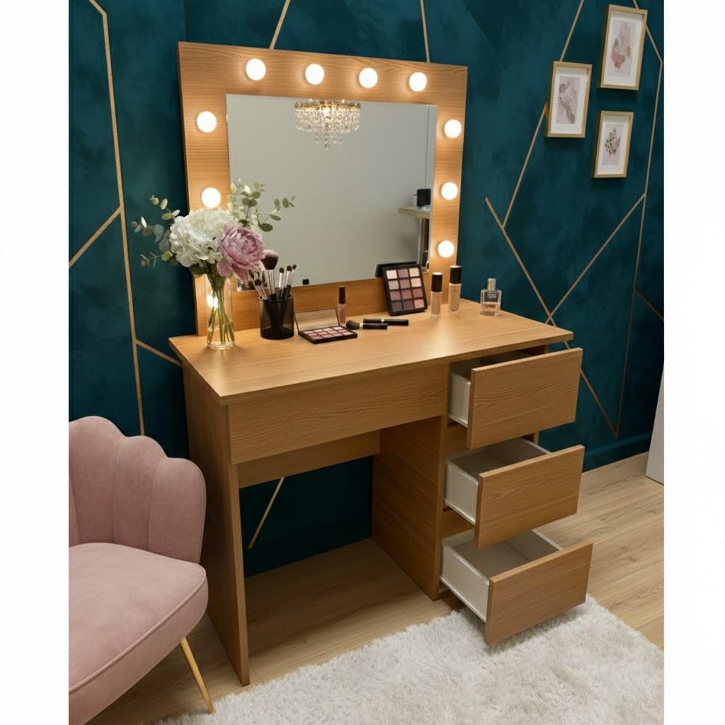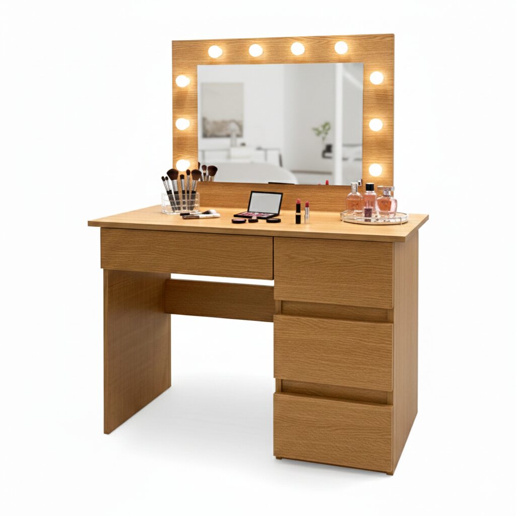 Masa de toaleta in culoarea naturala a stejarului, pentru machiaj, cu oglinda si 10 leduri este cu siguranta visul oricarei femei.